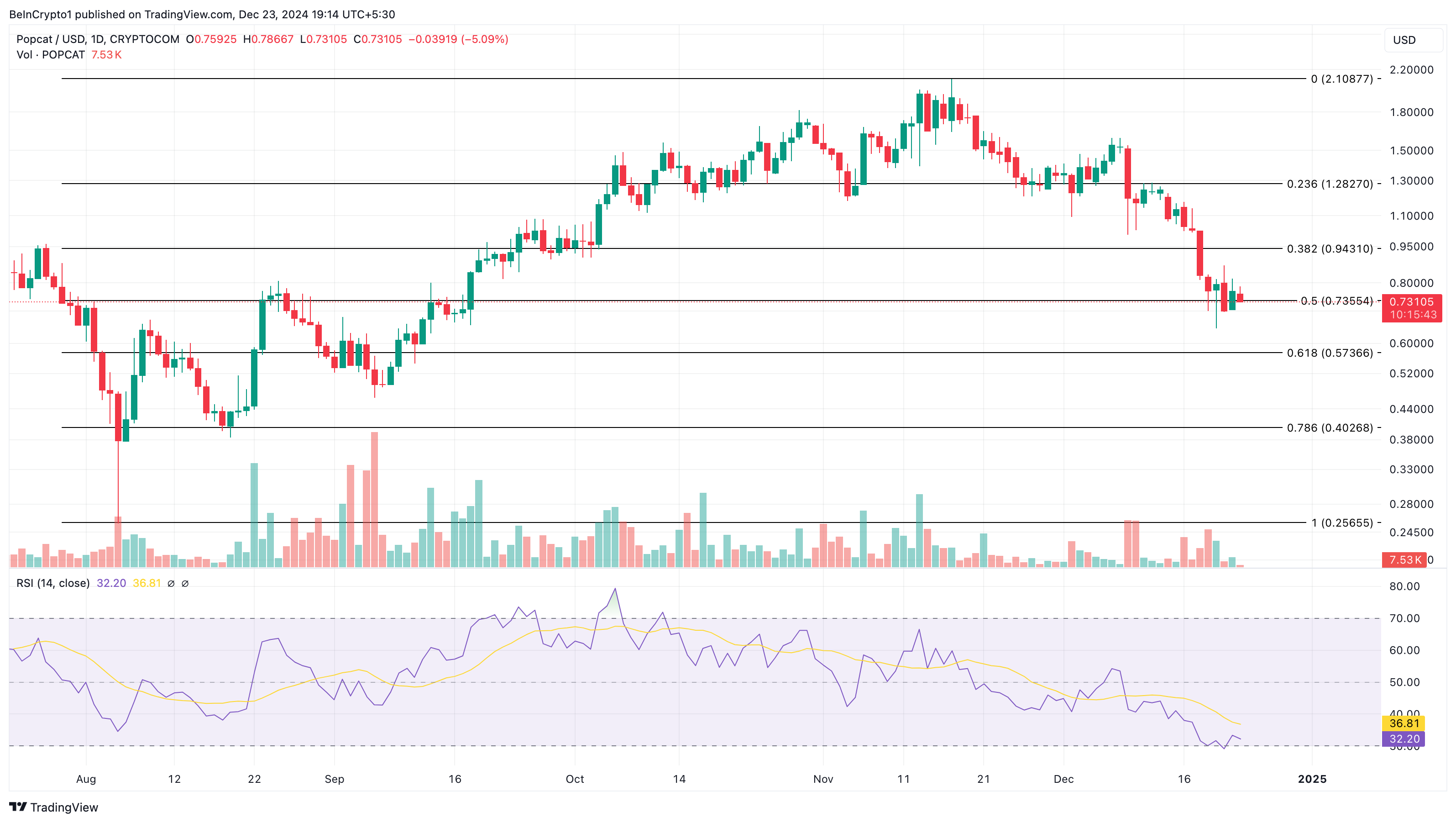 Bei 0,73 USD ist POPCAT 64 Prozent von seinem Allzeithoch von 2,05 USD entfernt. Auf dem Tageschart scheint der Token nahe der überverkauften Region zu sein. Dies liegt daran, dass der Relative Strength Index (RSI), der das Momentum misst, auf 32,20 gesunken ist.