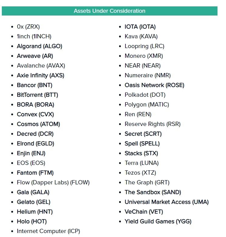 Unten siehst du die “Assets Under Consideration”, sprich die Assets, die Grayscale möglicherweise auch für institutionelle Investoren aufnehmen könnte.