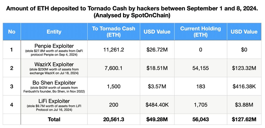Am 8. September meldete SpotOnChain, dass vier Hacker insgesamt 20.561 ETH (ungefähr 50 Millionen USD) im September durch Tornado Cash geschleust haben. Diese Gelder stehen mit bedeutenden Einbrüchen bei Penpie, WazirX, Bo Shen und LiFi in Verbindung.