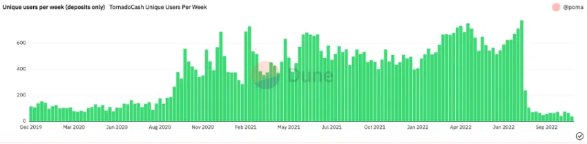 Ohne Frage war dies ein schwerer Schlag für den ohnehin schon geschwächten Kryptomixer. Daten von Dune zeigen außerdem einen deutlichen Rückgang der wöchentlichen Nutzerzahlen seit der Ankündigung der ersten Sanktionen im August 2022. Im Oktober sank die Zahl der Nutzer schließlich auf nur noch 40.