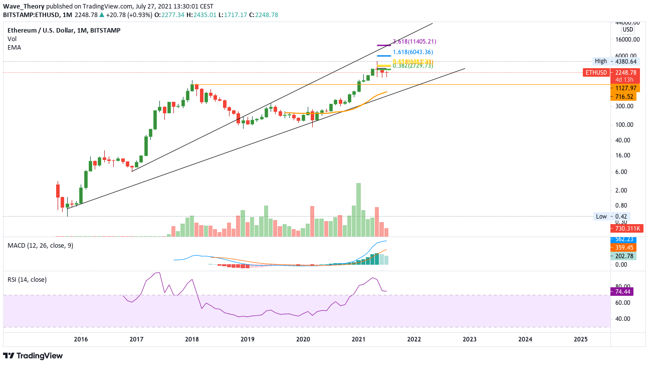 Bei Ethereum verhält sich das ebenso. Zwei aufeinanderfolgende rote Monatskerzen markieren hier in jedem Fall einen Bärentrend. Jeder Aufwärtstrend bei Ethereum zeigt maximal eine rote Kerze in einer Reihe von grünen Kerzen. Die Kursziele sind aber auch hier absolut realistisch: Ethereum findet erst bei 6.000 USD respektive 11.400 USD seine nächsten Widerstände. Historische Unterstützung wartet auf den Ethereum Kurs bei rund 1.100 USD respektive am 50-Monate-EMA bei rund 700 USD.
