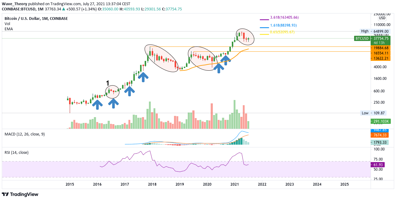 Sollte Bitcoin aber dieses Jahr seinen Bärentrend fortsetzen, so findet er zwischen 13.500 und 20.000 USD historische Unterstützung, welche nur mit sehr geringer Wahrscheinlichkeit gebrochen wird. Dort fungiert der 50-Monate-EMA bei rund 17.000 USD als Bodenanwärter. Diese Zone wäre für Bitcoin Bullen die optimale Kaufzone. Dafür müsste aber erst einmal die 30.000 USD respektive 25.000 USD gebrochen werden.