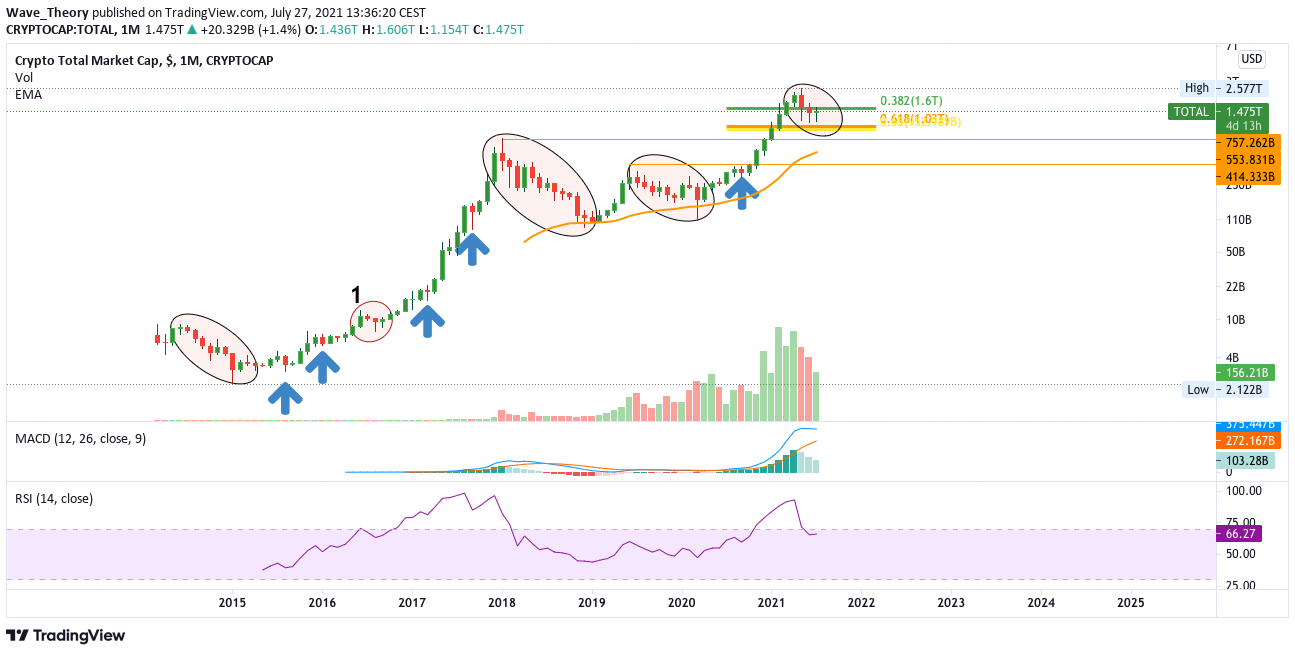 Der Kryptomarkt befindet sich nicht weit entfernt von der Golden Ratio Unterstützung bei rund 1 T USD (Billionen USD), woran der Kryptomarkt sehr stark bouncen könnte. Historische Unterstützung wartet auf den Kryptomarkt zwischen 400 B USD und 760 B USD (Milliarden USD). In diesem Bereich dient der 50-Monate-EMA bei 550 B USD als signifikante Unterstützung. Erst wenn der Kryptomarkt über die Gesamtmarktkapitalisierung von rund 2 T USD steigt, ist der Aufwärtstrend wieder intakt.