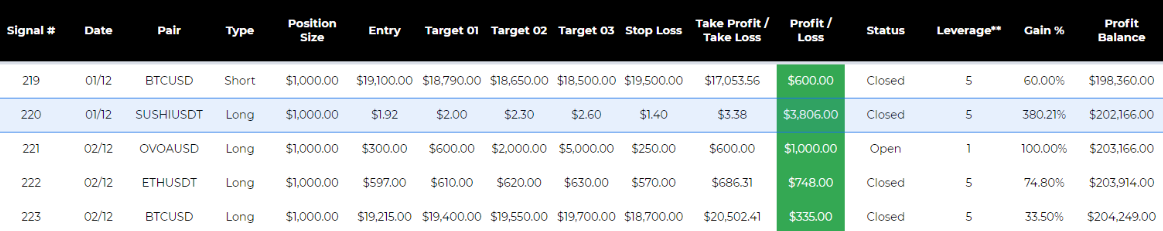 Und in Bezug auf Sushi, gibt es noch etwas zu berichten: Am 1. Dezember 2020 gab es im Premium Kanal den erfolgreichsten Trade zu verbuchen: SUSHIUSDT Long 380.21%.