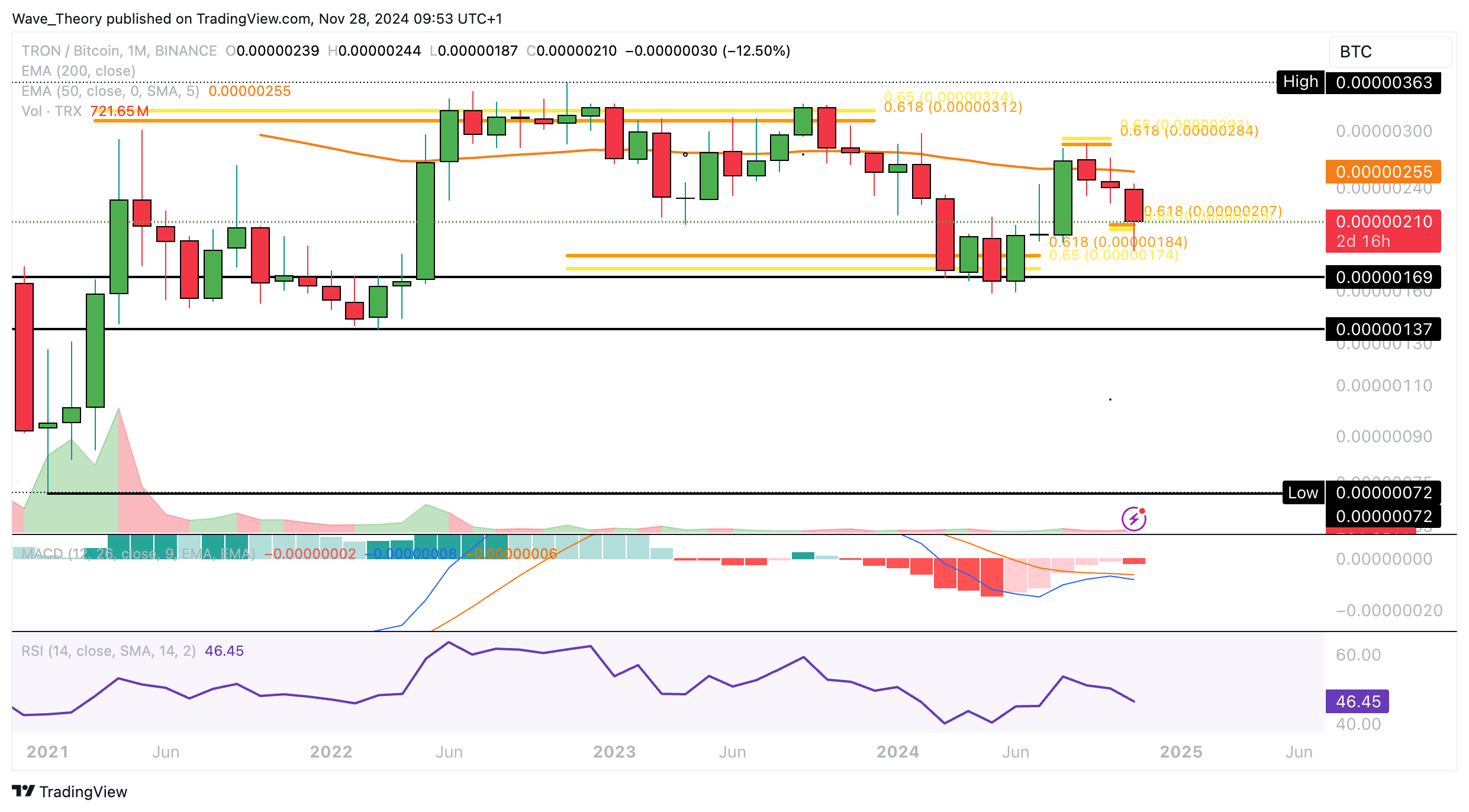 Nach oben hin fungiert der 50-Monate-EMA bei rund 0,00000255 BTC als signifikanter Widerstand.