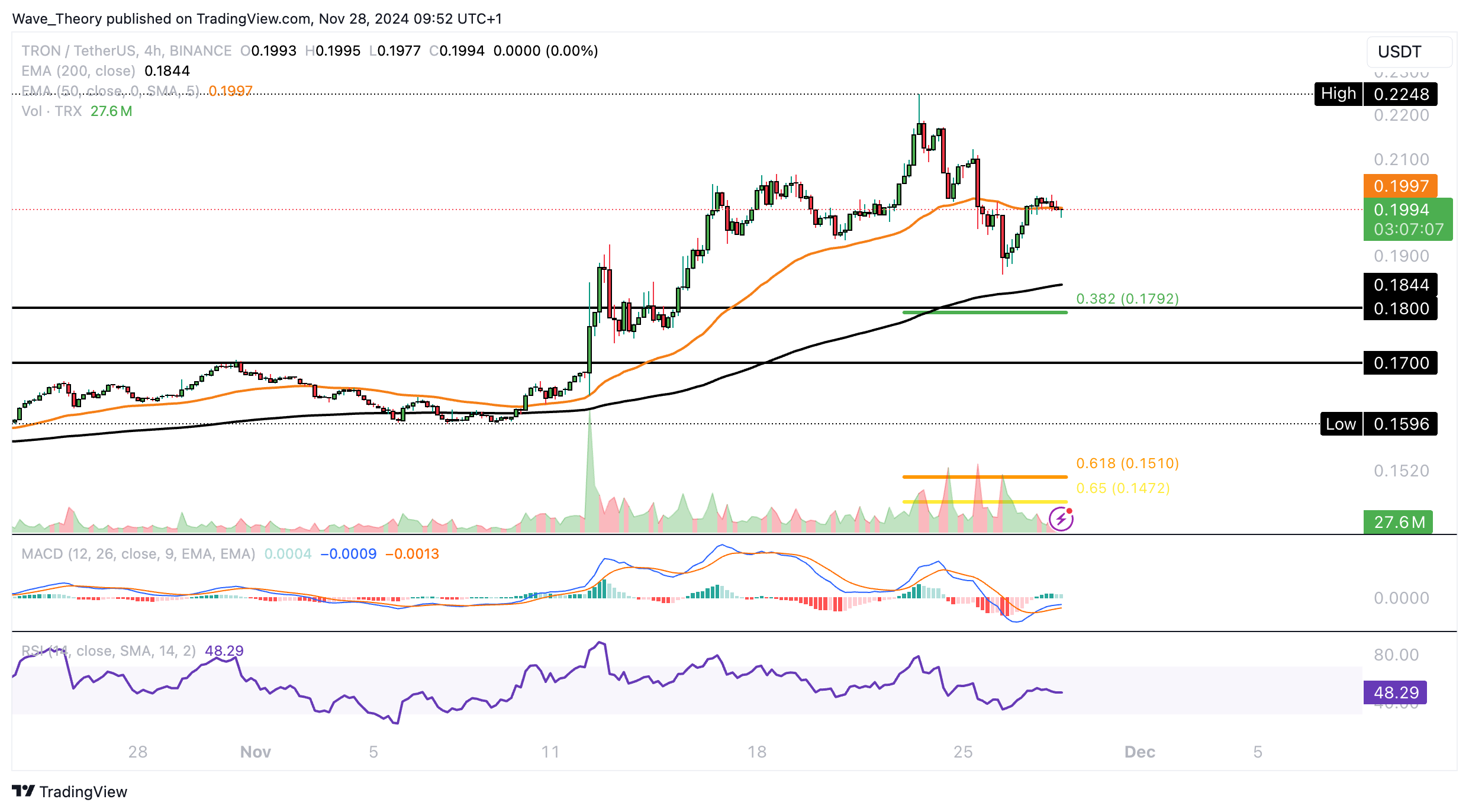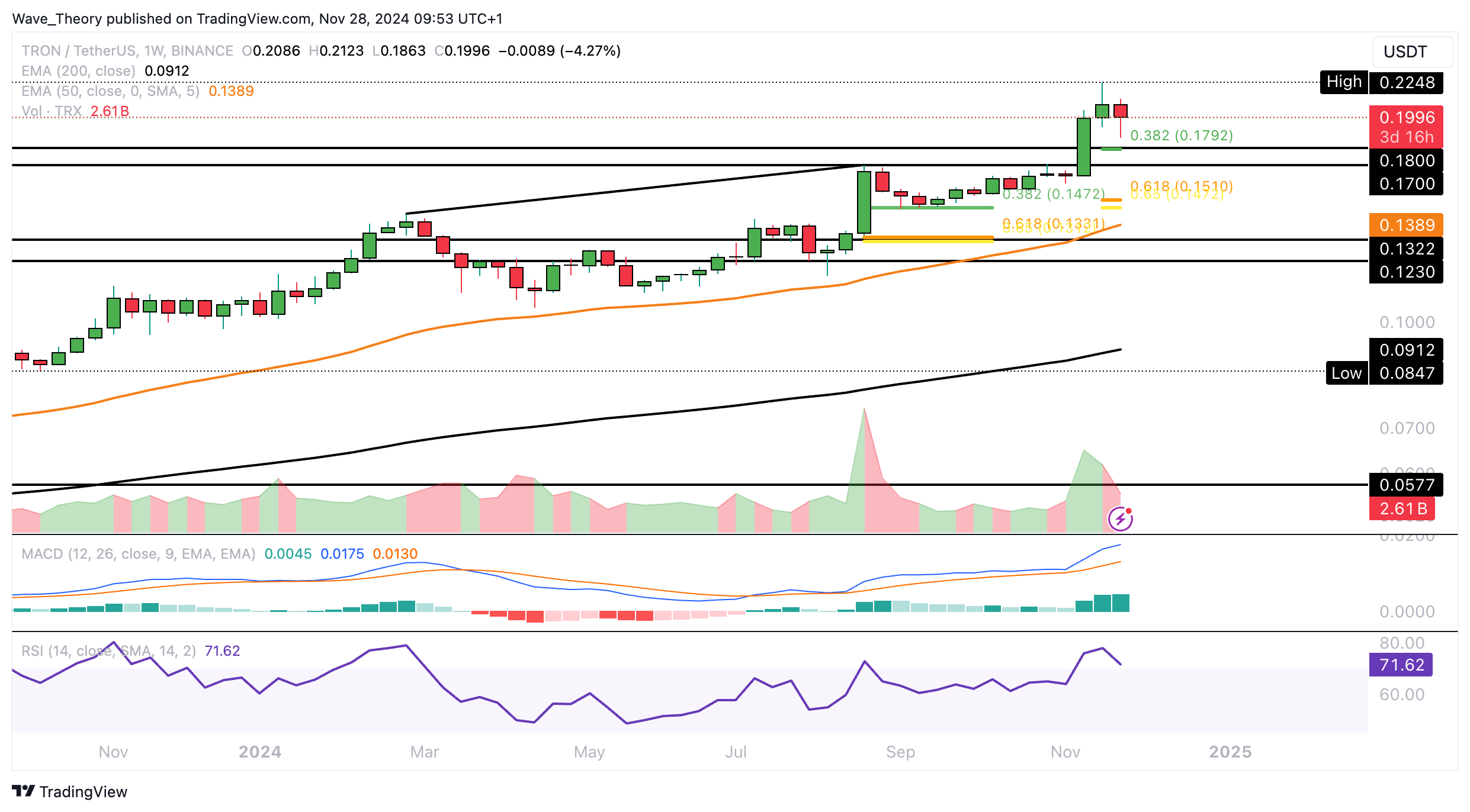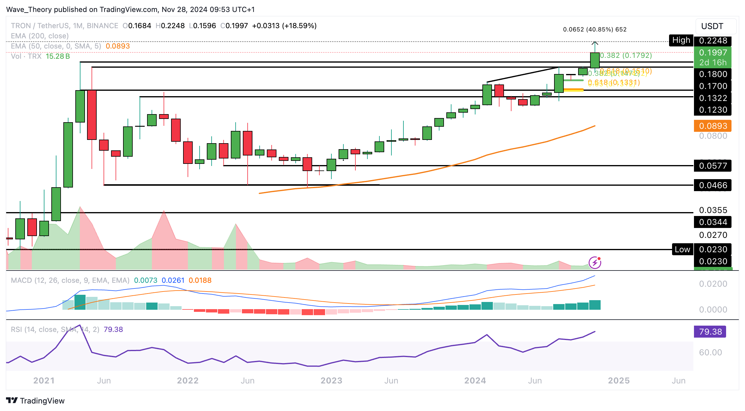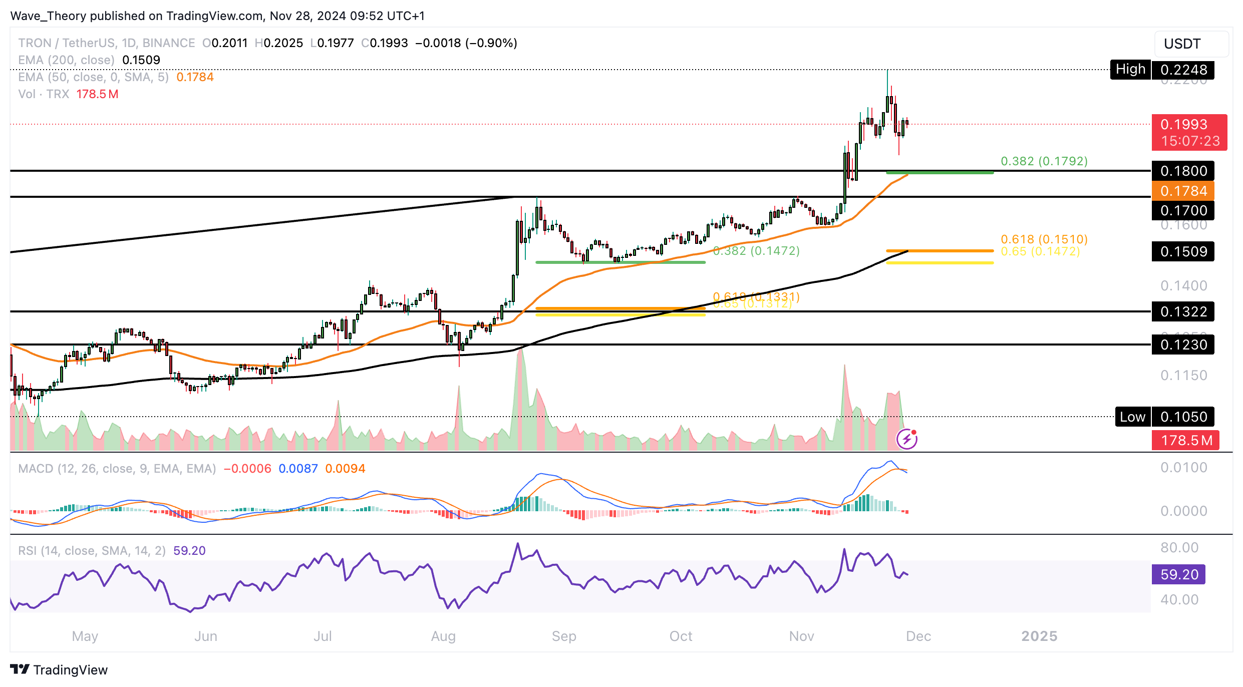 Der RSI bewegt sich währenddessen in neutralem Raum und grenzt an überkauften Regionen. Wenn TRON jetzt weiter korrigiert, warten bei rund 0,1792 USD und bei rund 0,15 USD die nächsten signifikanten Fibonacci Unterstützungen.