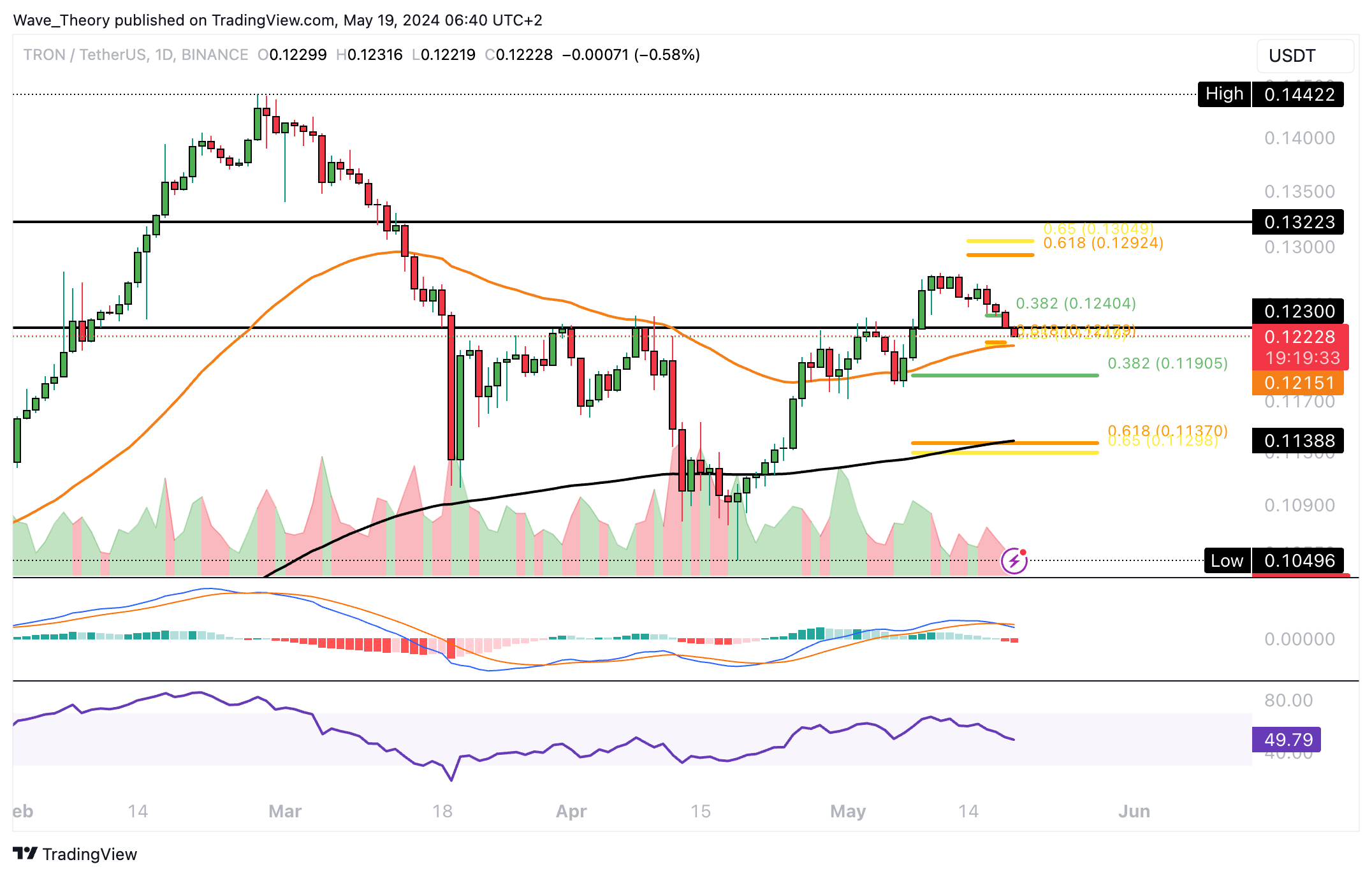 Damit könnte TRON jetzt zur Golden Ratio Unterstützung am 50-Tage-EMA bei rund 0,1215 USD korrigieren. Sollte diese Unterstützung nicht halten, wartet bei rund 0,119 USD die nächste signifikante Fib Unterstützung.