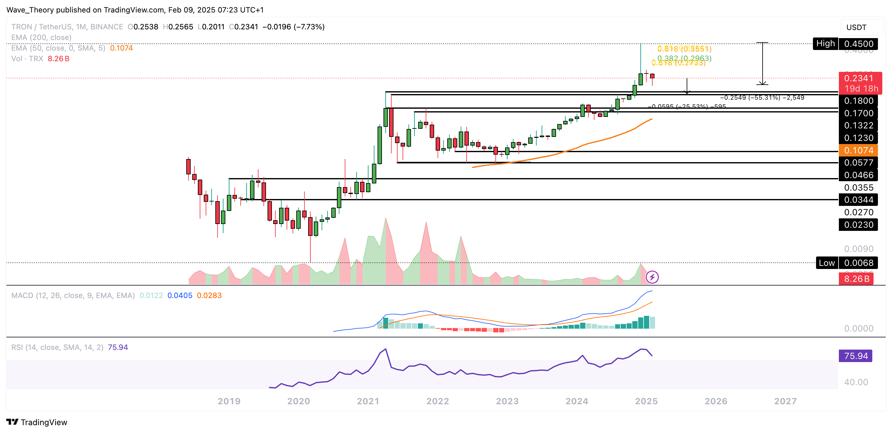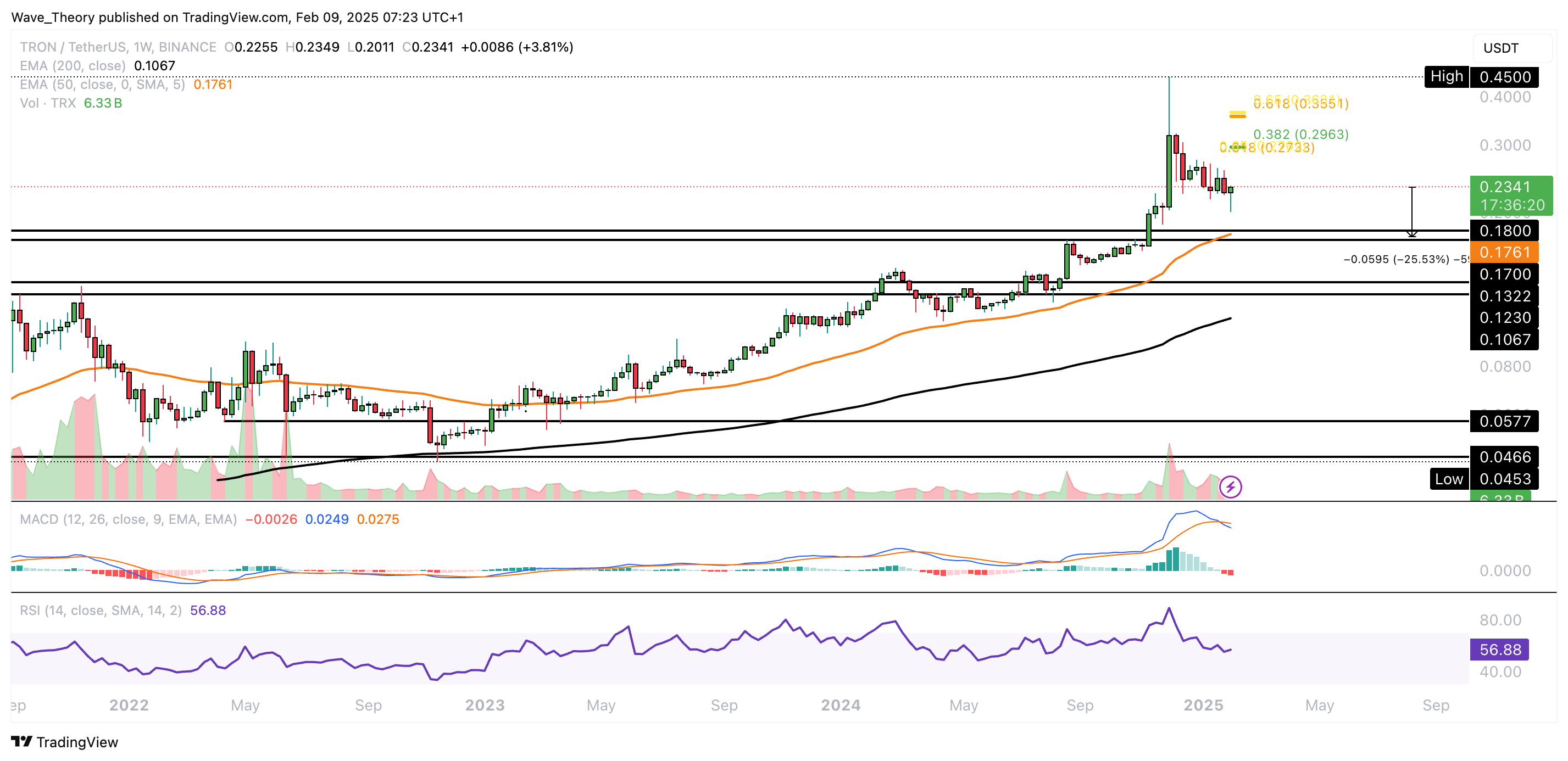 TRON stößt jetzt am 50-Tage-EMA bei rund 0,24 USD auf den nächsten signifikanten Widerstand. Bricht TRON diesen Widerstand, könnte er zum 0,382 Fib Niveau bei rund 0,296 USD steigen.