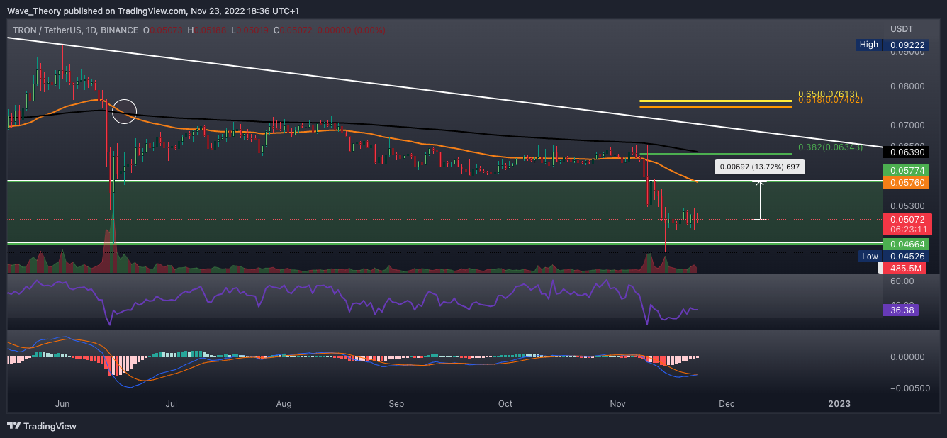 Kurzfristig könnte der TRX Kurs jetzt bullisch an der Unterstützungszone abprallen. Sollte TRON jetzt am 200-Wochen-EMA bei rund 0,0475 USD abprallen, könnte TRX bis zum 50-Wochen-EMA bei rund 0,066 USD steigen.