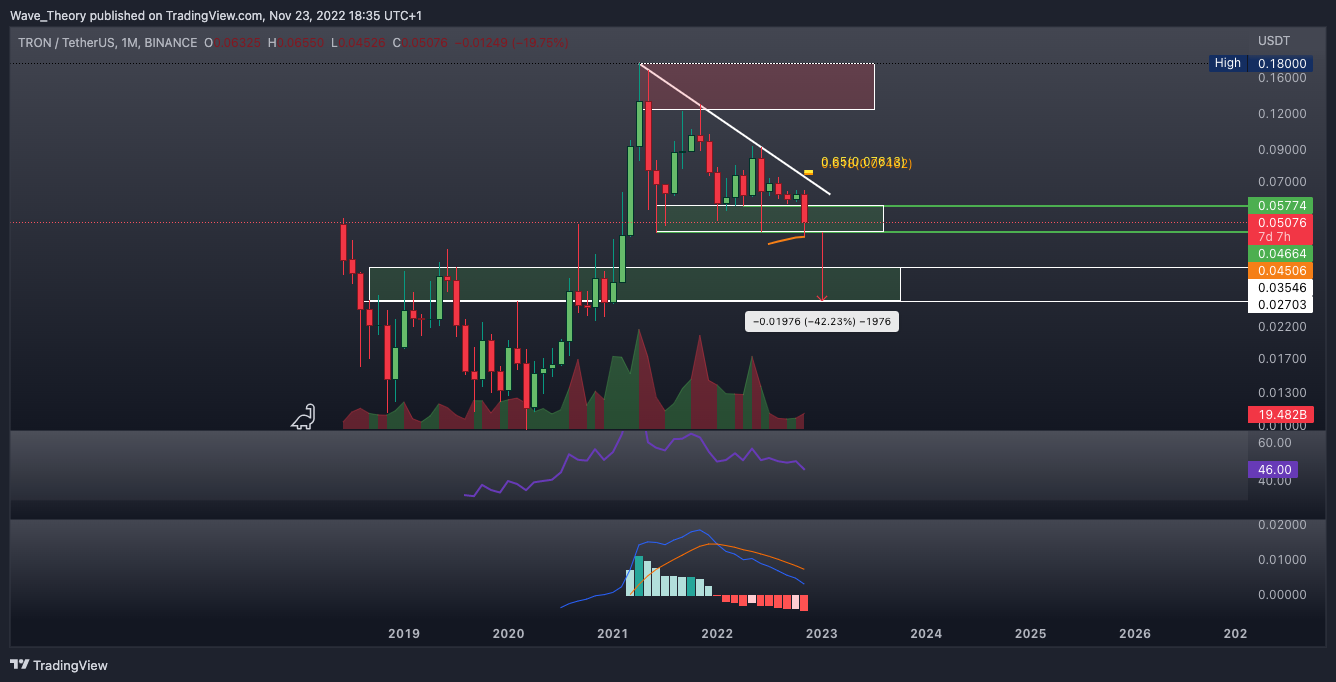 Der TRX Kurs hat sehr bärische Wochen hinter sich. In diesem Monat fiel der TRX Kurs von rund 0,064 USD zum 50-Monate-EMA bei rund 0,045 USD zurück, woran TRX jetzt abprallen könnte. Damit befindet sich der TRX Kurs nun erneut in der Unterstützungszone zwischen 0,046 USD und 0,058 USD.