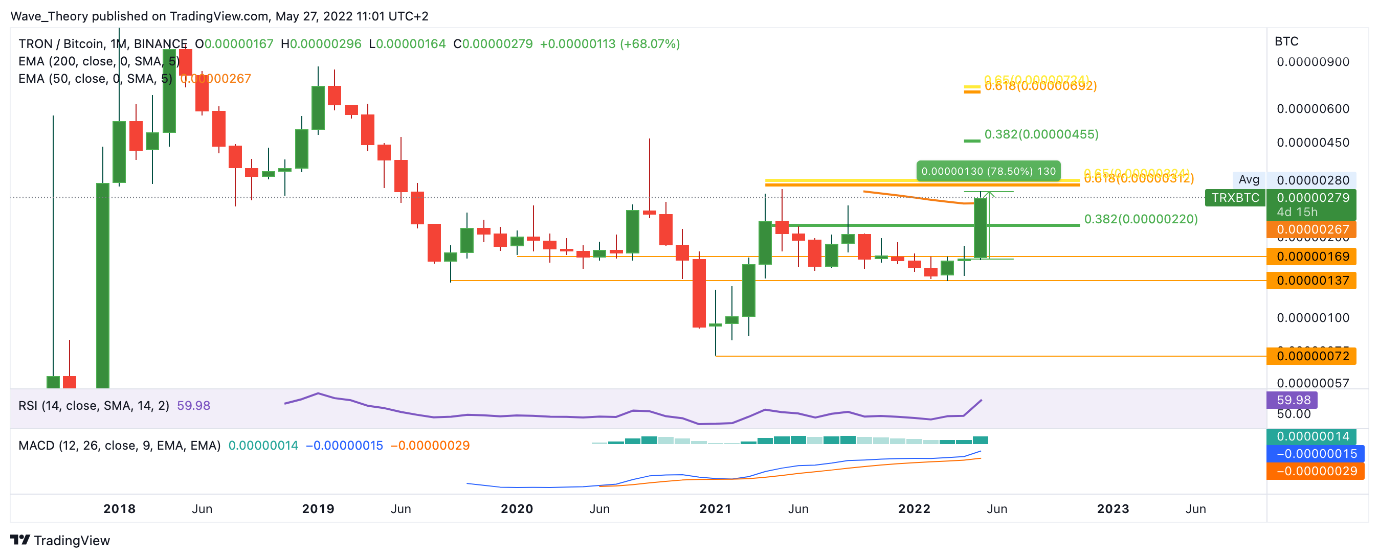 Der TRON Kurs konnte gegen BTC rund 79 % in diesem Monat steigen. Damit befindet sich der TRON Kurs bereits über dem 50-Monate-EMA und kurz davor, den Golden Ratio Widerstand bei rund 0,00000315 BTC zu erreichen. Sollte TRON erneut an der Golden Ratio bei rund 0,00000315 BTC scheitern, findet er wieder zwischen 0,0000014 – 0,0000017 BTC Unterstützung.