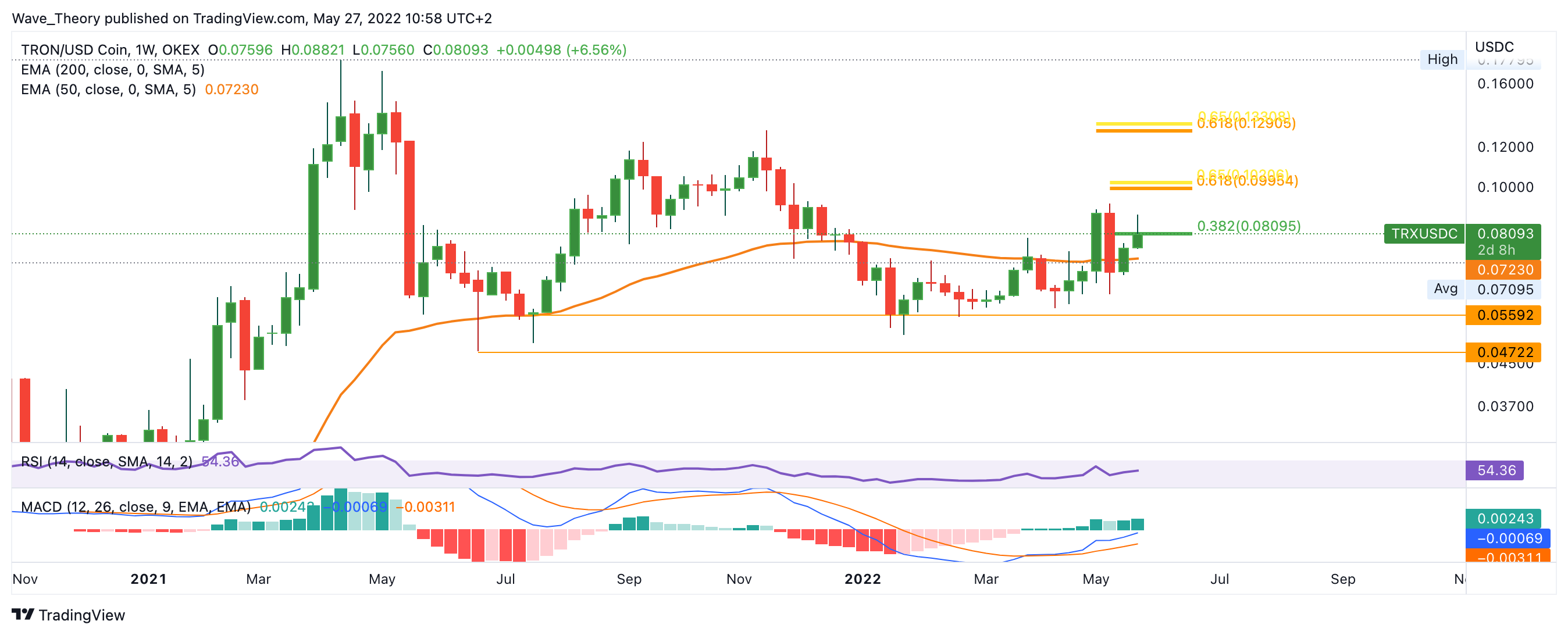 Sollte der TRON Preis unter dem 0,382 Fib Niveau bei rund 0,08 USD schließen, wäre eine bärische Abweisung die Folge. Dann könnte der TRON Kurs kurzfristig zum 50-Wochen-EMA bei rund 0,072 USD zurückkehren.