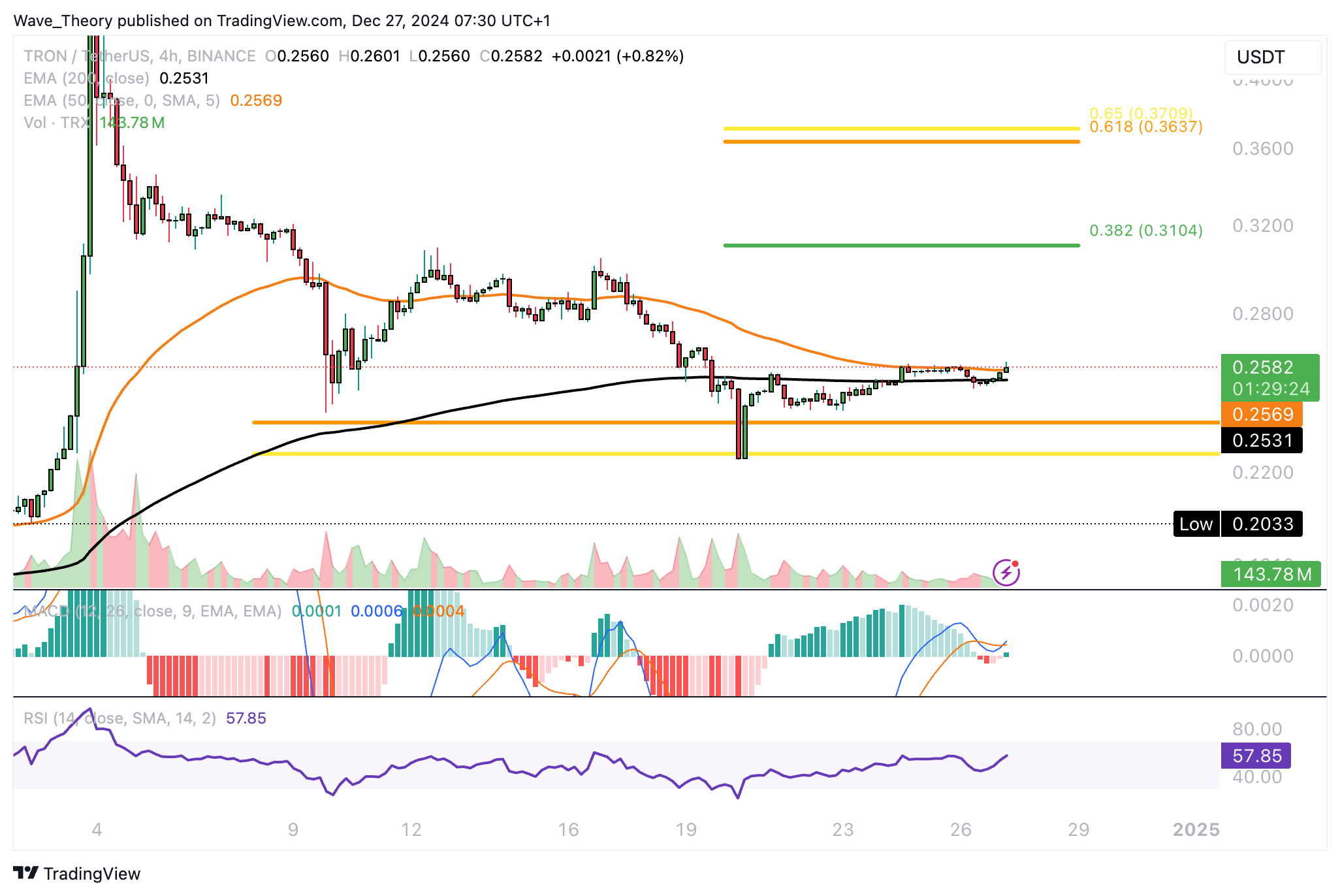 Der TRON Kurs konnte an der Golden Ratio Unterstützung bei rund 0,22 USD bullisch abprallen und sich seither über dem 50-Tage-EMA bei rund 0,242 USD halten.