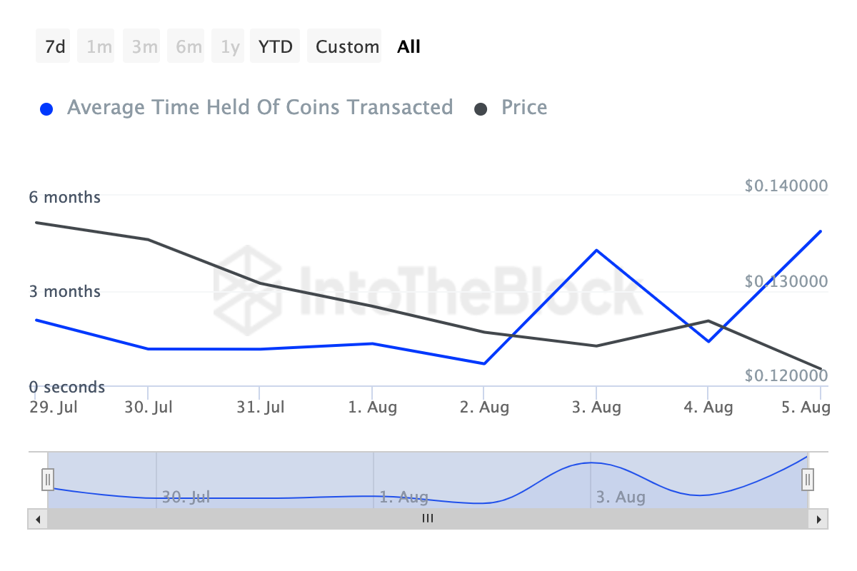 Jedoch zeigt die On-Chain-Metrik „Coin Holding Time“ von TRX nicht dasselbe Bild. Diese Metrik misst, wie lange eine Kryptowährung gehalten wurde, ohne dass sie gehandelt oder potenziell verkauft wurde.
