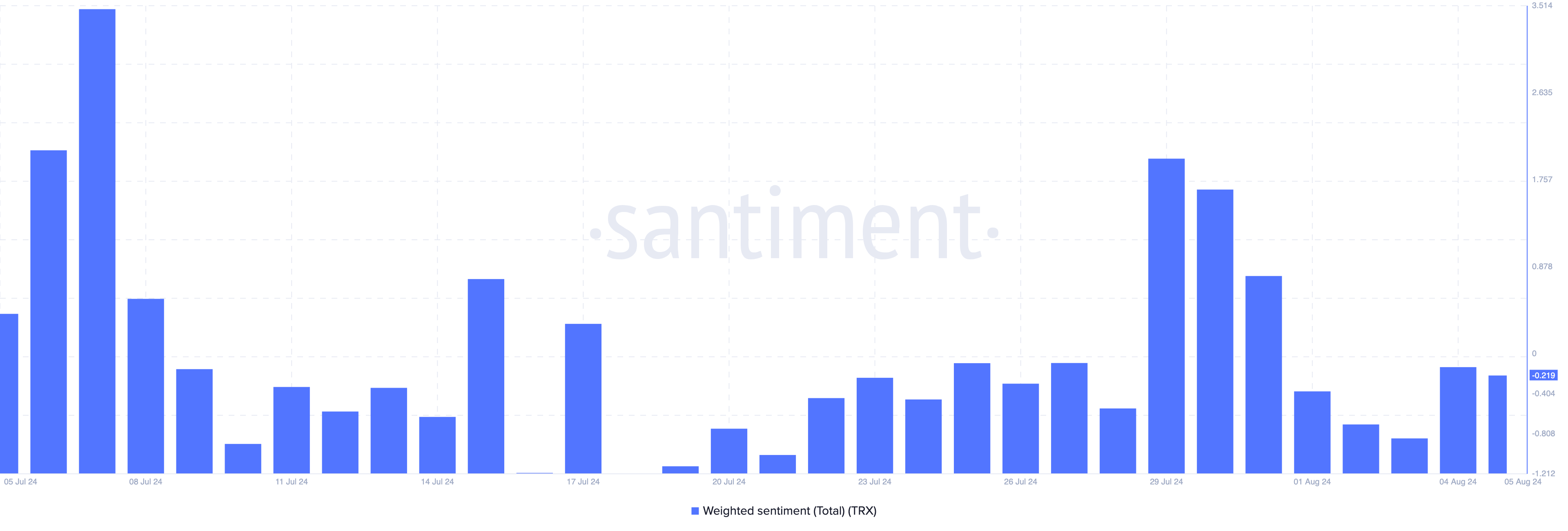 Unterdessen zeigt das gewichtete Sentiment von Tron, dass der breitere Markt vorsichtig sein könnte, hohe Überzeugung für den Token zu zeigen. Dies liegt daran, dass die Sentiment-Bewertung weiterhin im negativen Bereich bleibt.