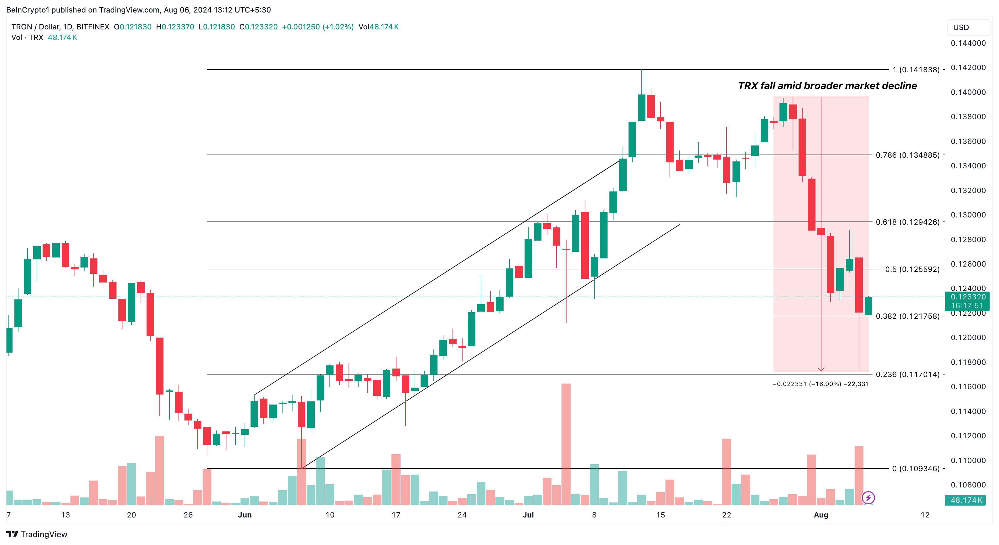 Laut dem Tageschart stieg der TRX-Kurs von 0,10 USD auf 0,14 USD in den ersten zwei Wochen des Juli. Doch jüngste Kursbewegungen zeigen, dass der Bär Druck auf den Token ausgeübt hat, mit einem Wert von 0,12 USD.