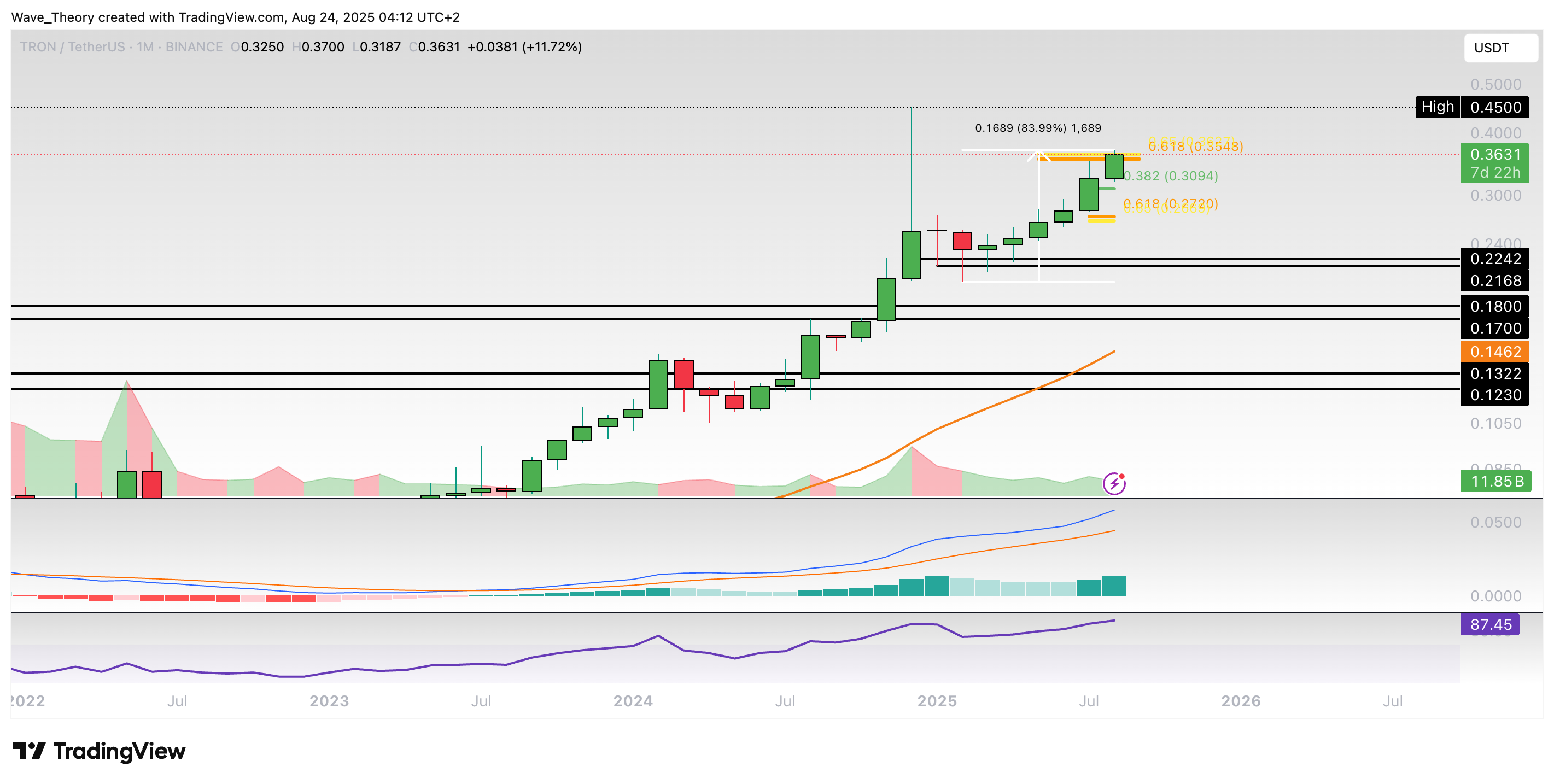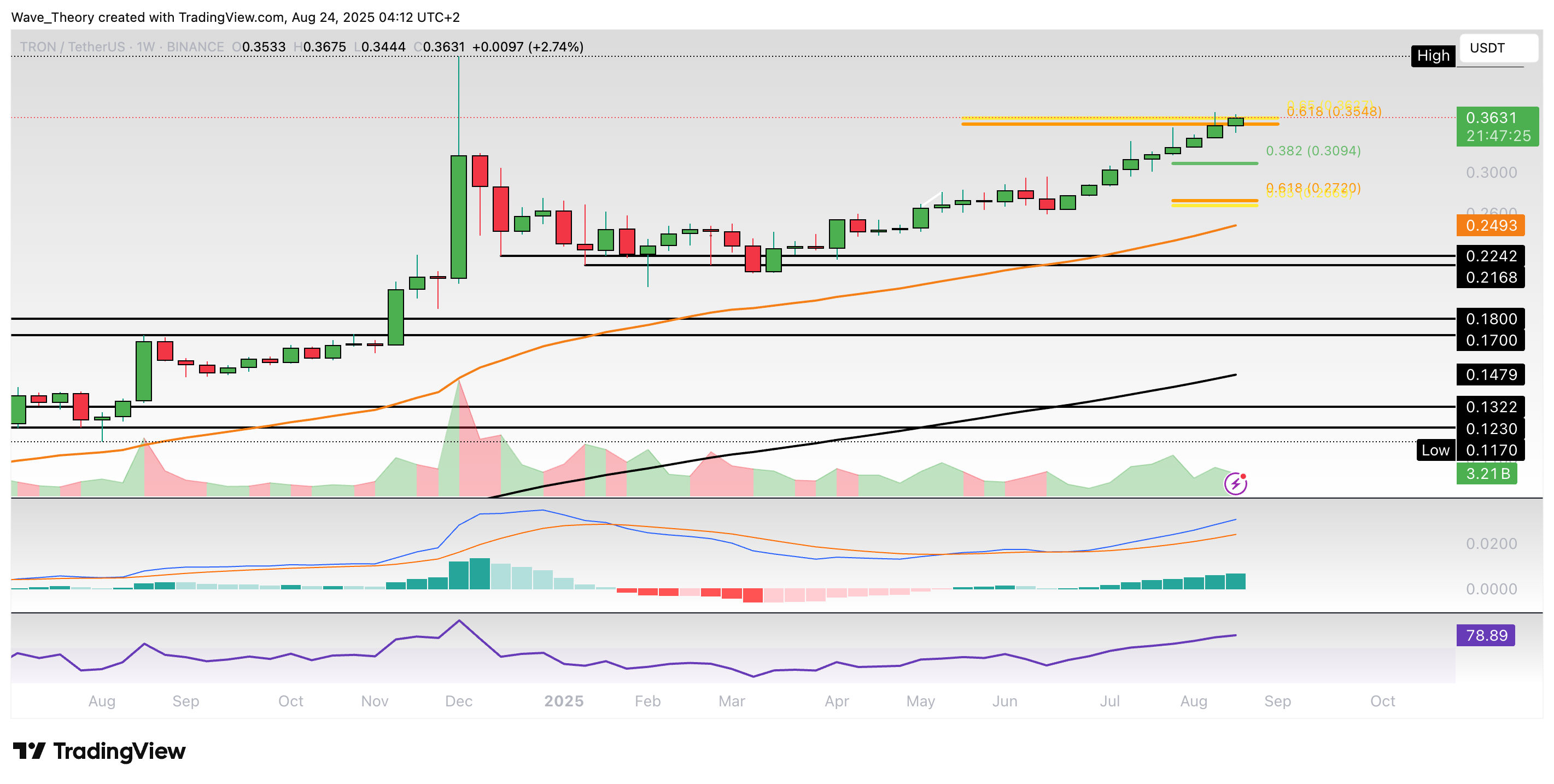 TRON stößt jetzt bei rund 0,36 USD auf signifikanten Golden Ratio Widerstand. Mit einem bullischen Bruch könnte TRON auf das letzte Hoch bei rund 0,45 USD zurückkehren oder dieses gar übersteigen.