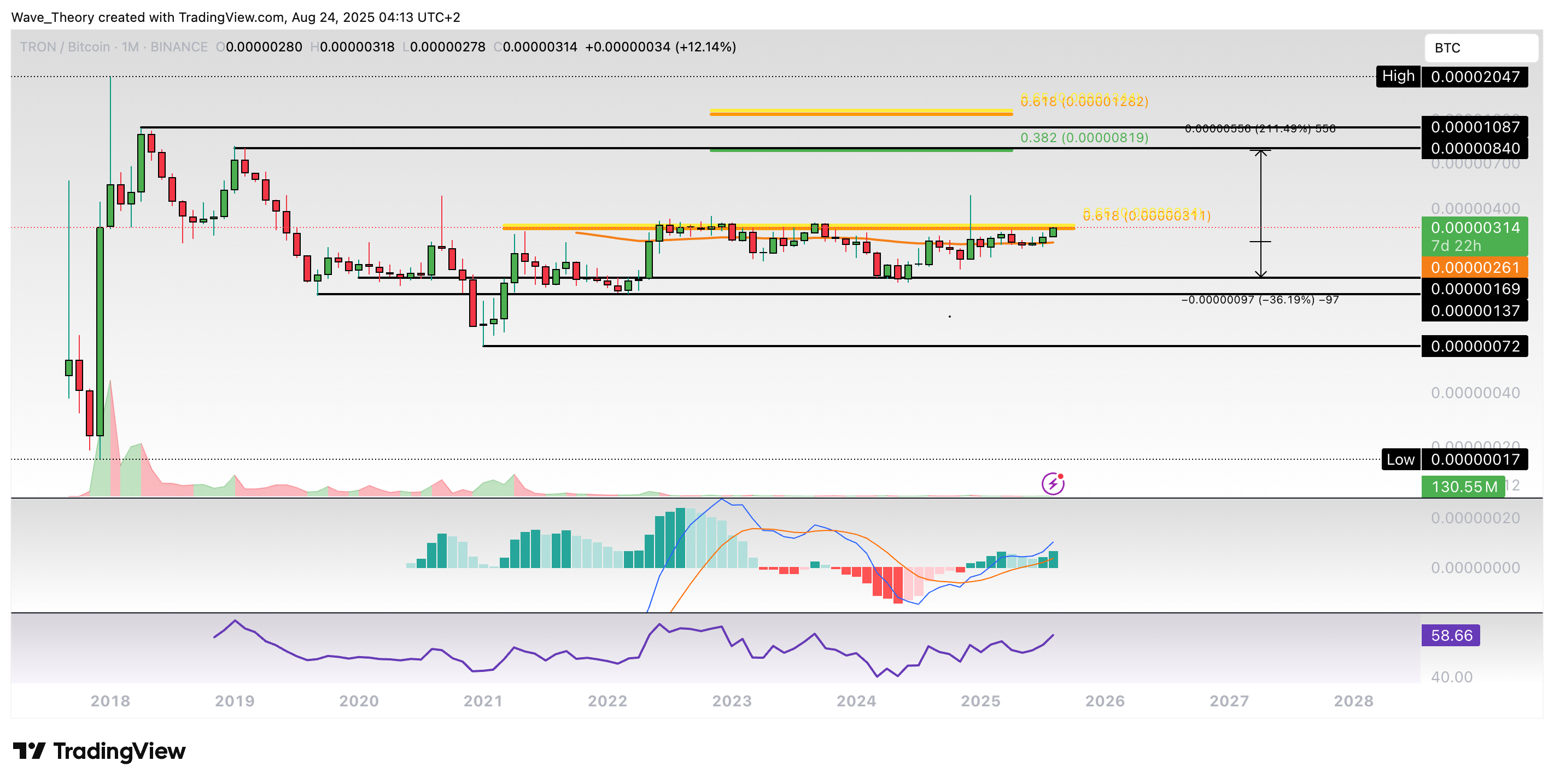 Gegen Bitcoin befindet sich der TRX Kurs am Golden Ratio Widerstand bei rund 0,000000312 BTC. Wenn TRON diesen Widerstand überwindet, könnte er rund 211 % steigen, um das 0,382 Fib Niveau bei rund 0,00000082 BTC zu erreichen.