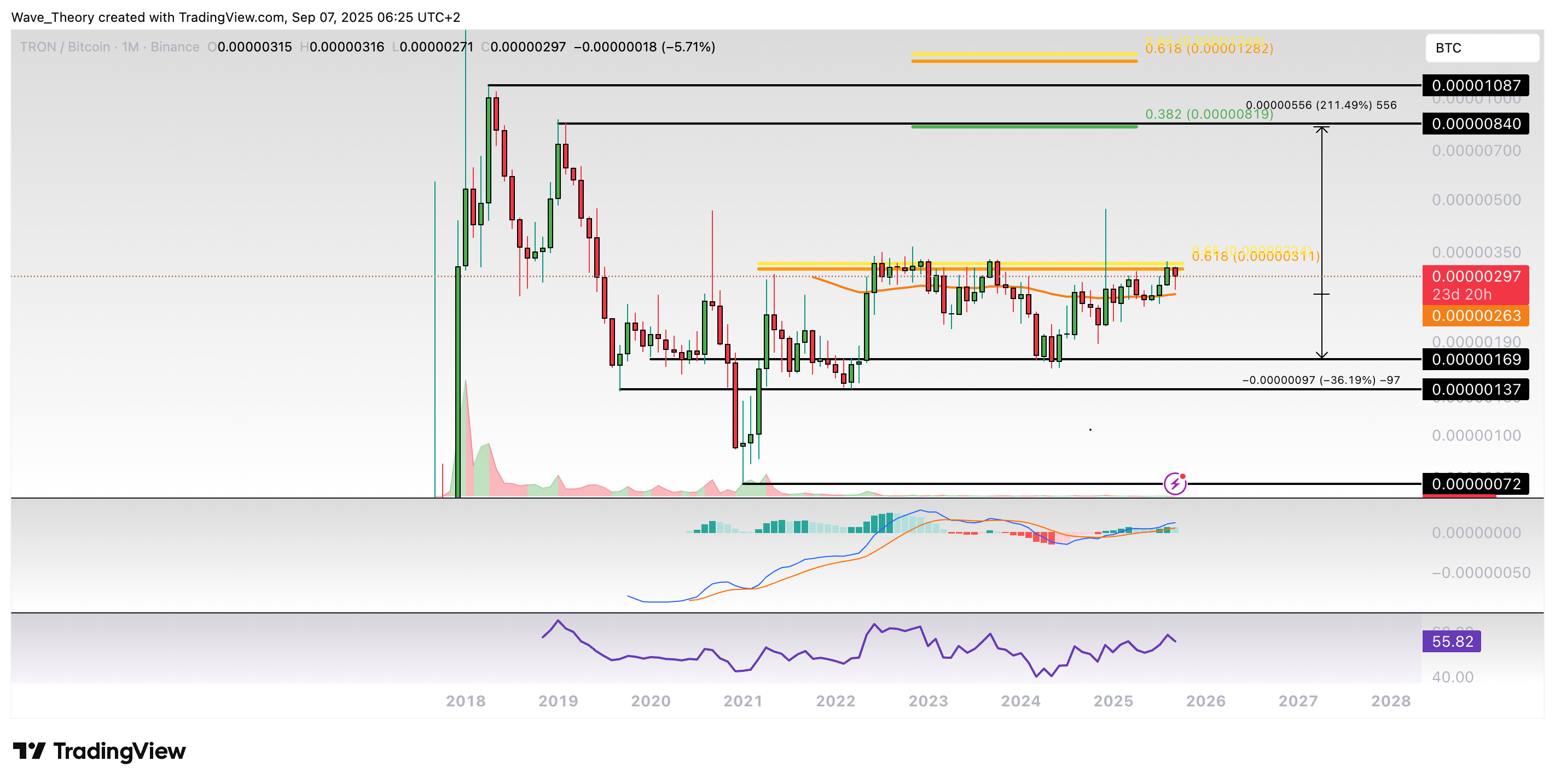 Gegen Bitcoin stößt der TRON Kurs jetzt am Golden Ratio Niveau bei rund 0,0000003 BTC auf signifikanten Widerstand, woran der Kurs bärisch abgewiesen zu werden scheint. Sollte er den Widerstand jedoch brechen können, könnte der Kurs um rund 212 % steigen, um das 0,382 Fib Niveau bei rund 0,00000082 BTC zu erreichen.
