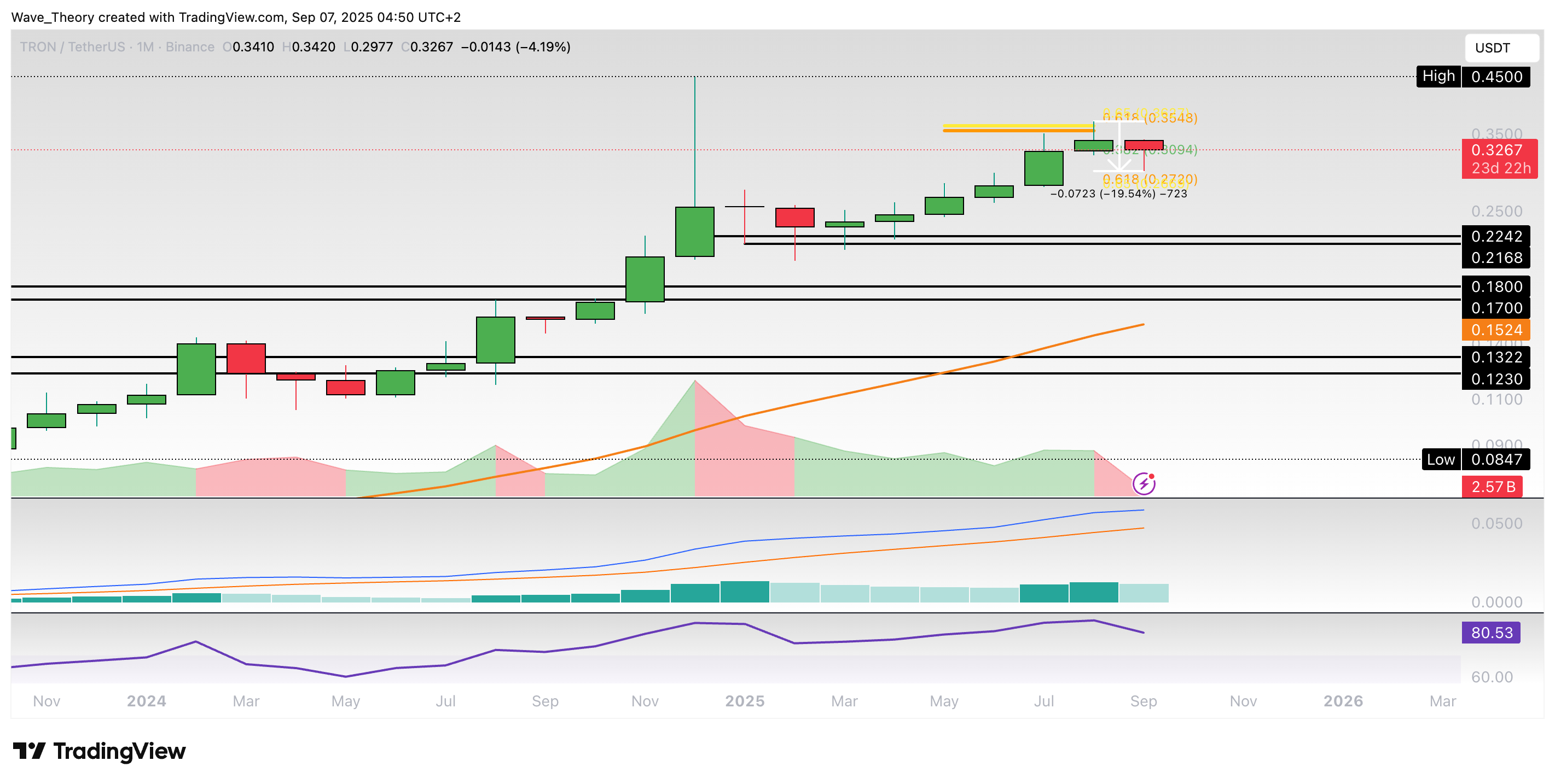 Nach einem halben Jahr Aufwärtsbewegung geht es in diesem Monat bergab. So konnte der TRON Kurs den Golden Ratio Widerstand bei rund 0,36 USD erreichen, woran der Kurs bärisch abgewiesen wurde.