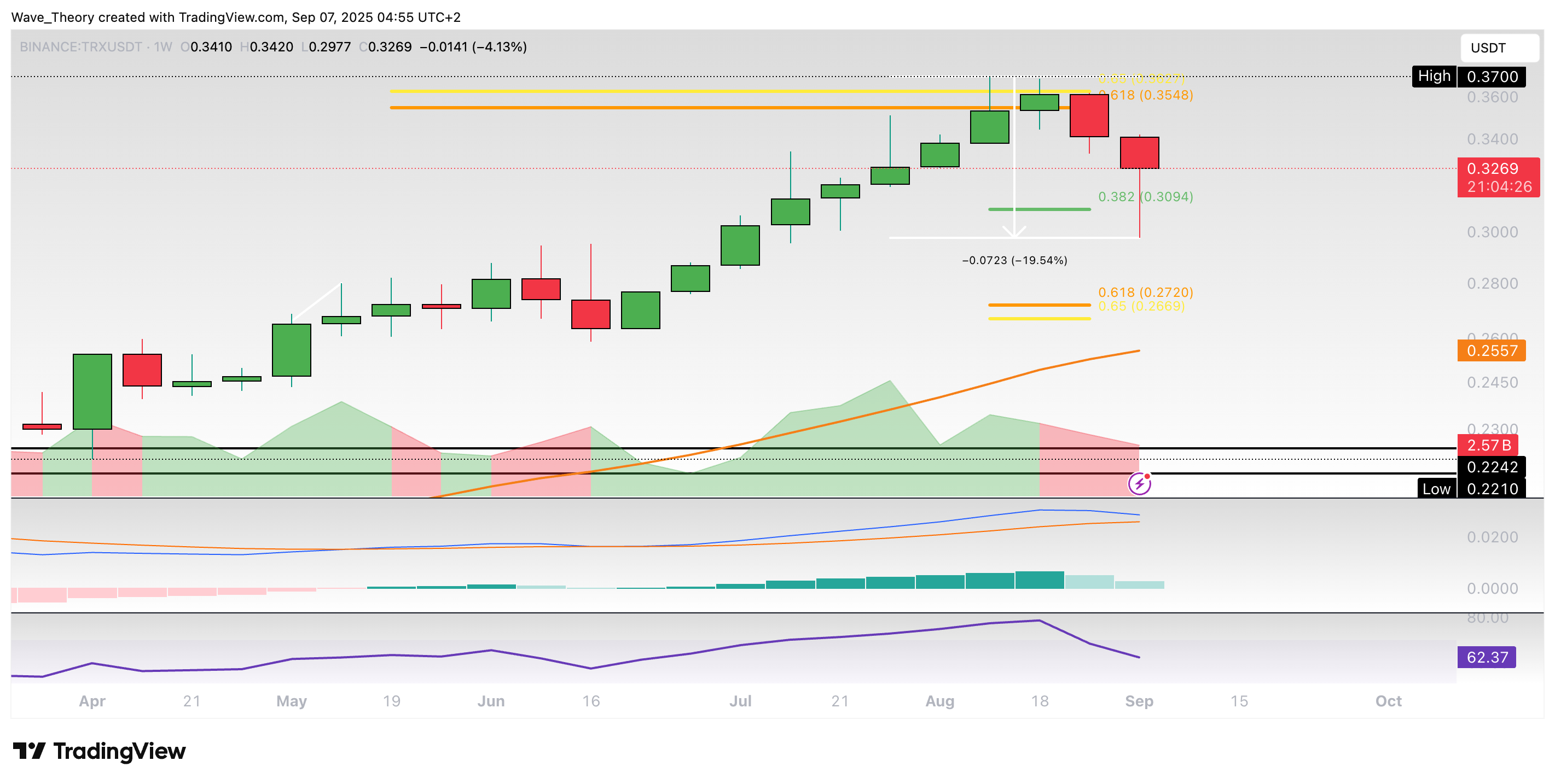 Wenn TRON jetzt weiter steigt, liegen bei rund 0,325 USD und 0,345 USD die nächsten signifikanten Fibonacci Widerstände. Erst mit dem Bruch der Golden Ratio bei rund 0,345 USD ist die Korrekturphase beendet.