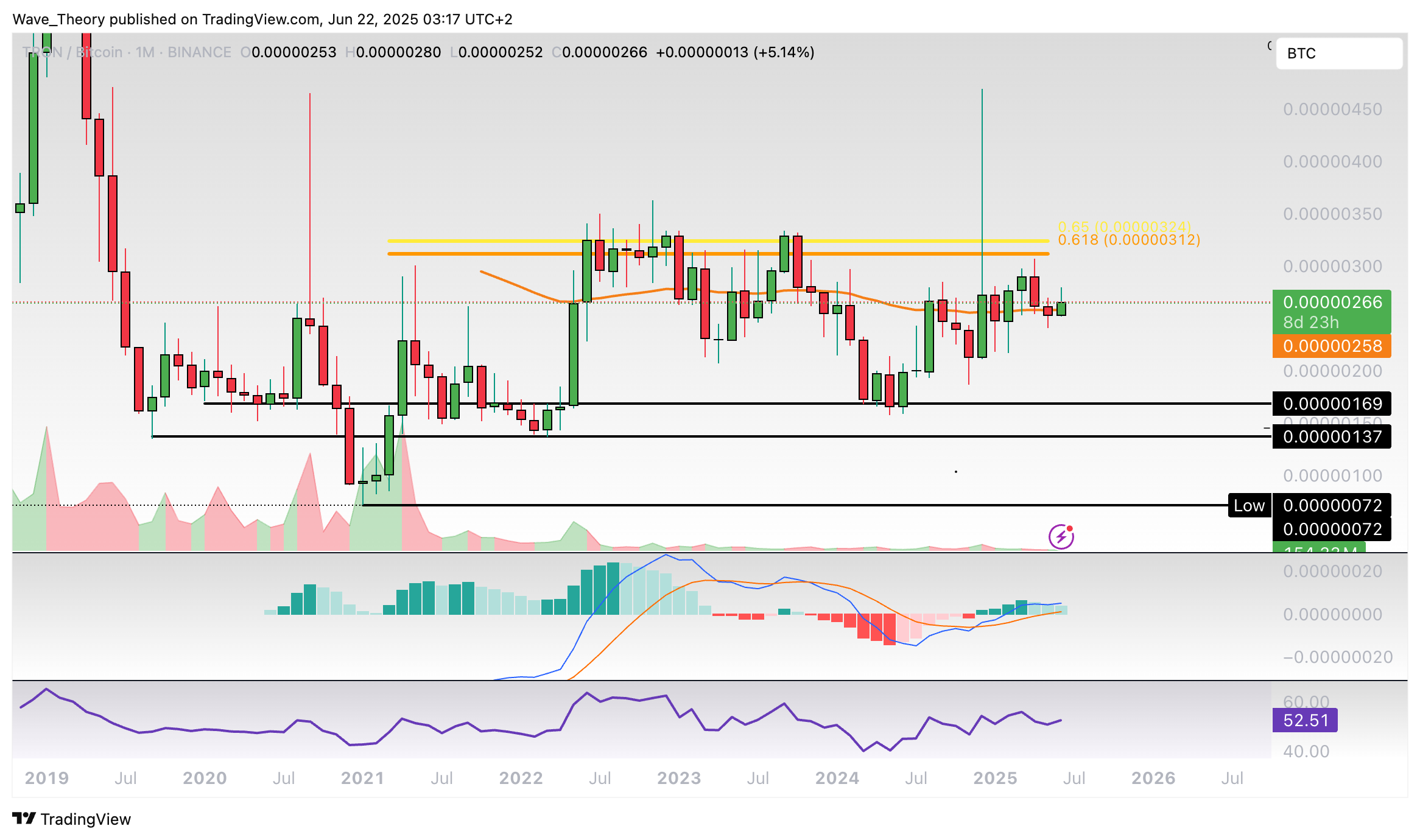 Nach unten hin wartet spätestens zwischen rund 0,000000137 BTC und 0,000000169 BTC signifikante Unterstützung. Nach oben hin findet TRON nach wie vor am Golden Ratio Niveau isgnifikanten Widerstand.
