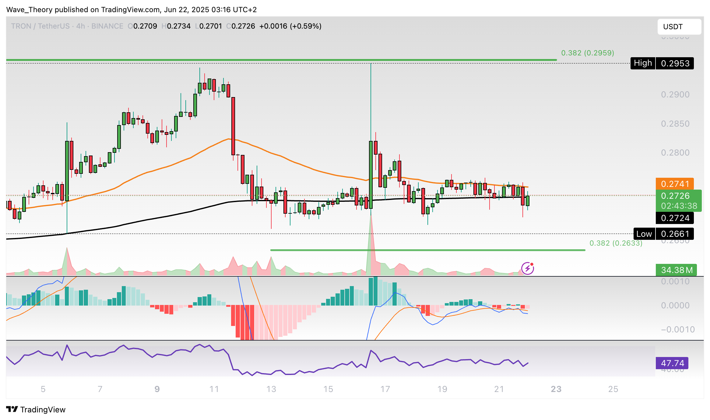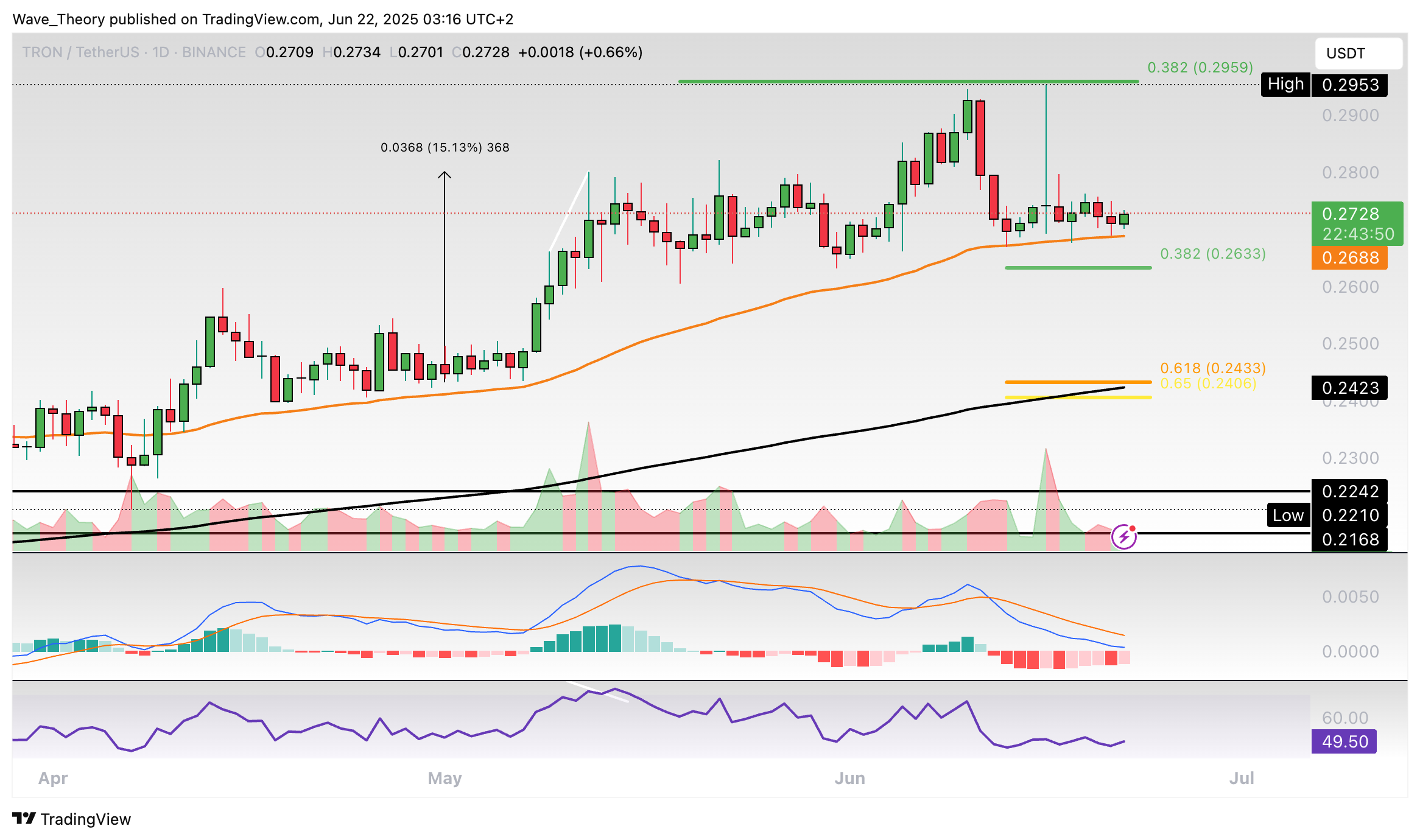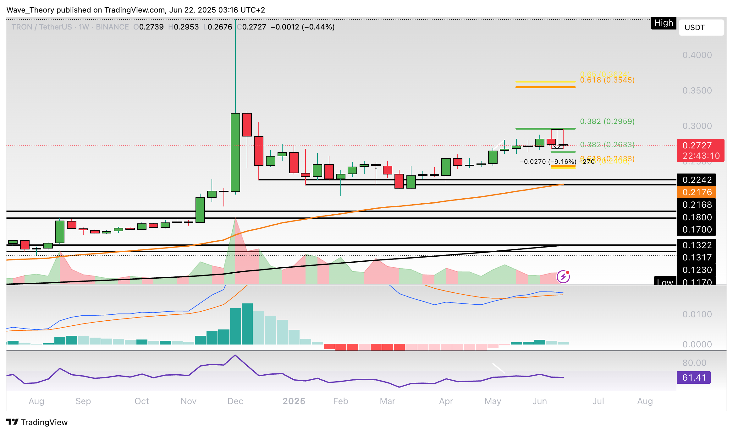 TRON-Prognose für Samstag, 22. Juni 2025: Der TRX Kurs wurde vor wenigen Tagen am 0,382 Fib Widerstand bärisch abgewiesen.