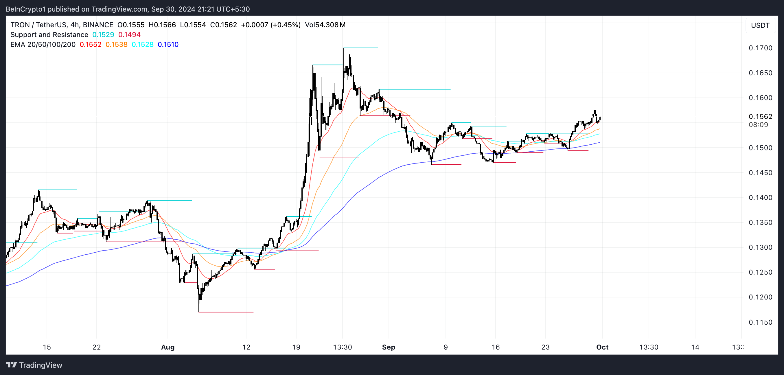 Sponsored SponsoredWenn jedoch der Abstand zwischen diesen Linien minimal ist, wie es bei Tron der Fall ist, wird die Stärke des Trends in Frage gestellt. Das signalisiert, dass er möglicherweise nicht stark genug ist, um weitere bedeutende Aufwärtsbewegungen zu unterstützen.