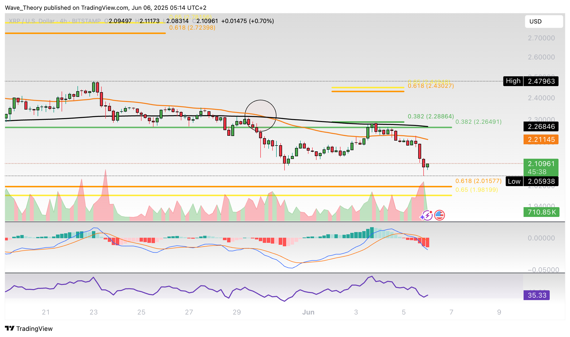 Im 4H-Chart haben die EMAs ein Death Cross geformt, womit der Trend kurzfristig bärisch bestätigt ist. Darüber hinaus wurde der Ripple Kurs vor wenigen Tagen am 0,382 Fib Widerstand bei rund 2,288 USD bärisch abgewiesen.
