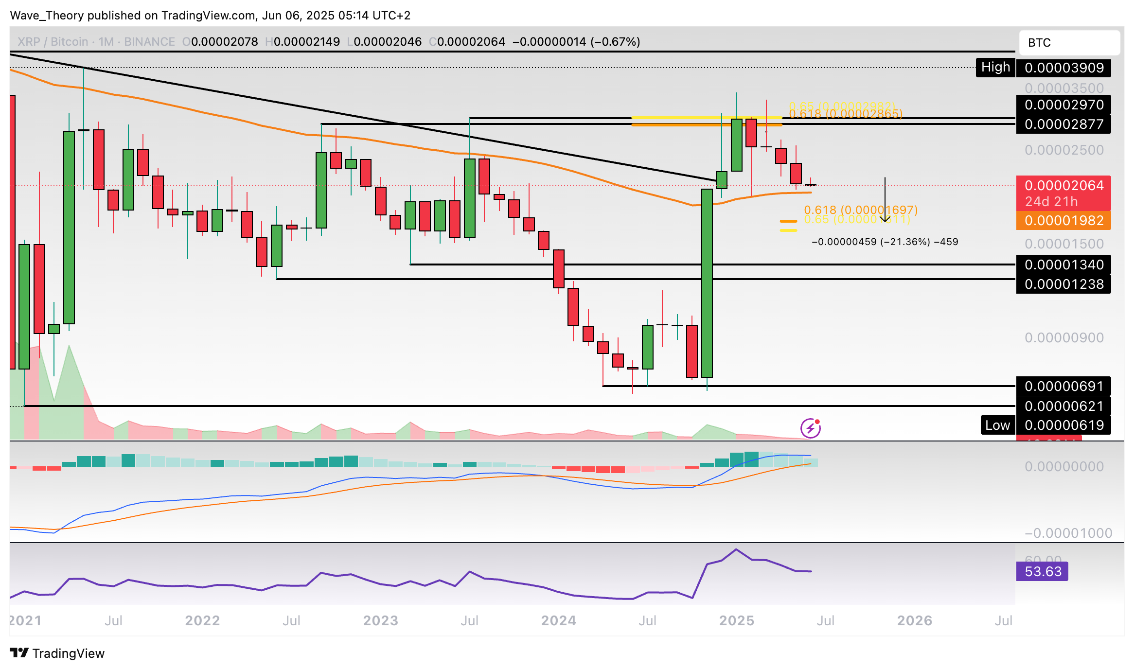Nach oben hin wartet nach wie vor am Golden Ratio Niveau bei rund 0,000029 BTC signifikanter Widerstand. Davon abgesehen sind zwar die MACD Linien noch bullisch überkreuzt, jedoch tickt das Histogramm des MACDs seit vier Monaten bärisch tiefer.
