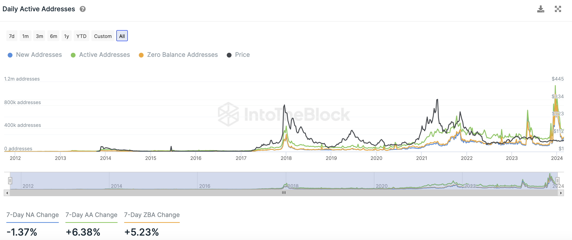 In den letzten sieben Tagen ist die Anzahl an neuen Adressen um rund 1,4 % gesunken, wohingegen die Anzahl an aktiven Adressen um rund 6,4 % gestiegen ist. Adressen, die kein LTC Guthaben aufweisen, sind dabei an der Zahl um rund 5,2 % gewachsen.