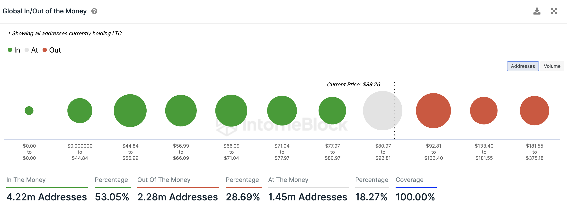 Sollte der LTC Kurs also noch weiter steigen, könnten 18,3 % weitere Adressen in die Gewinnzone rutschen.