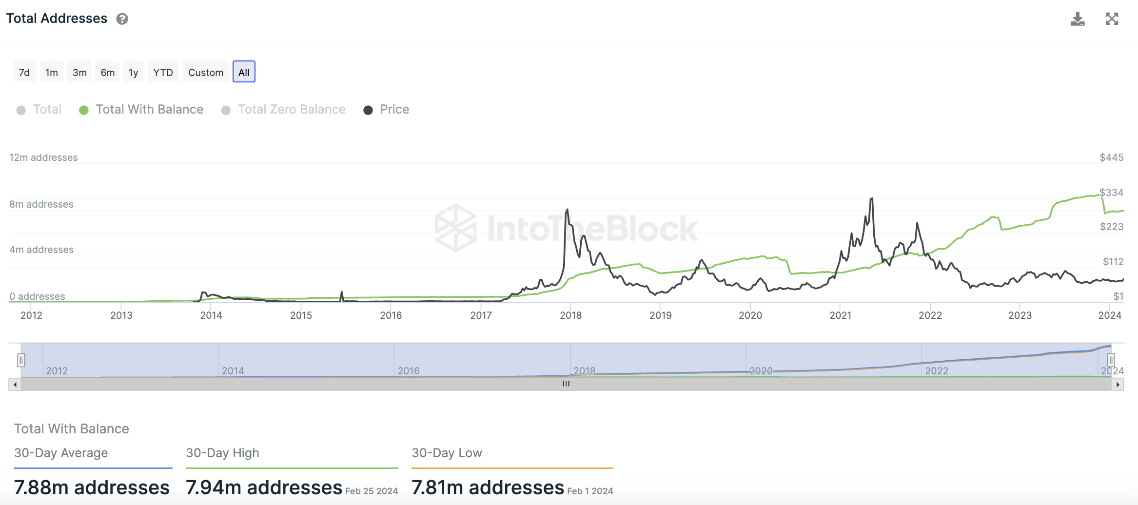 Die Gesamtzahl der LTC Adressen hat einen weiteren Rückschlag erlitten. In den letzten 30 Tagen wurden durchschnittlich nur noch 7,88 Millionen Litecoin Adressen gezählt, die ein Litecoin Guthaben aufweisen.