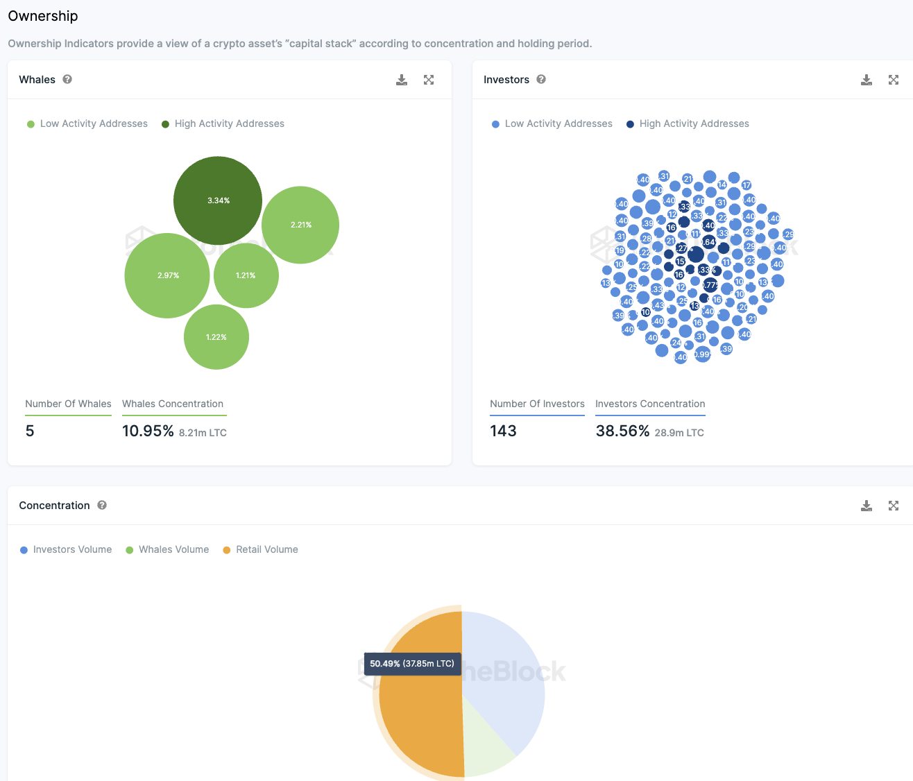 Etwa 50,5 % aller LTC Token sind im Besitz von Kleinanleger:innen. Dagegen verfügen nur fünf Wal Adressen, jede mit einem Anteil von mehr als 1 % des Gesamtvolumens, über insgesamt rund 11 % der Token.