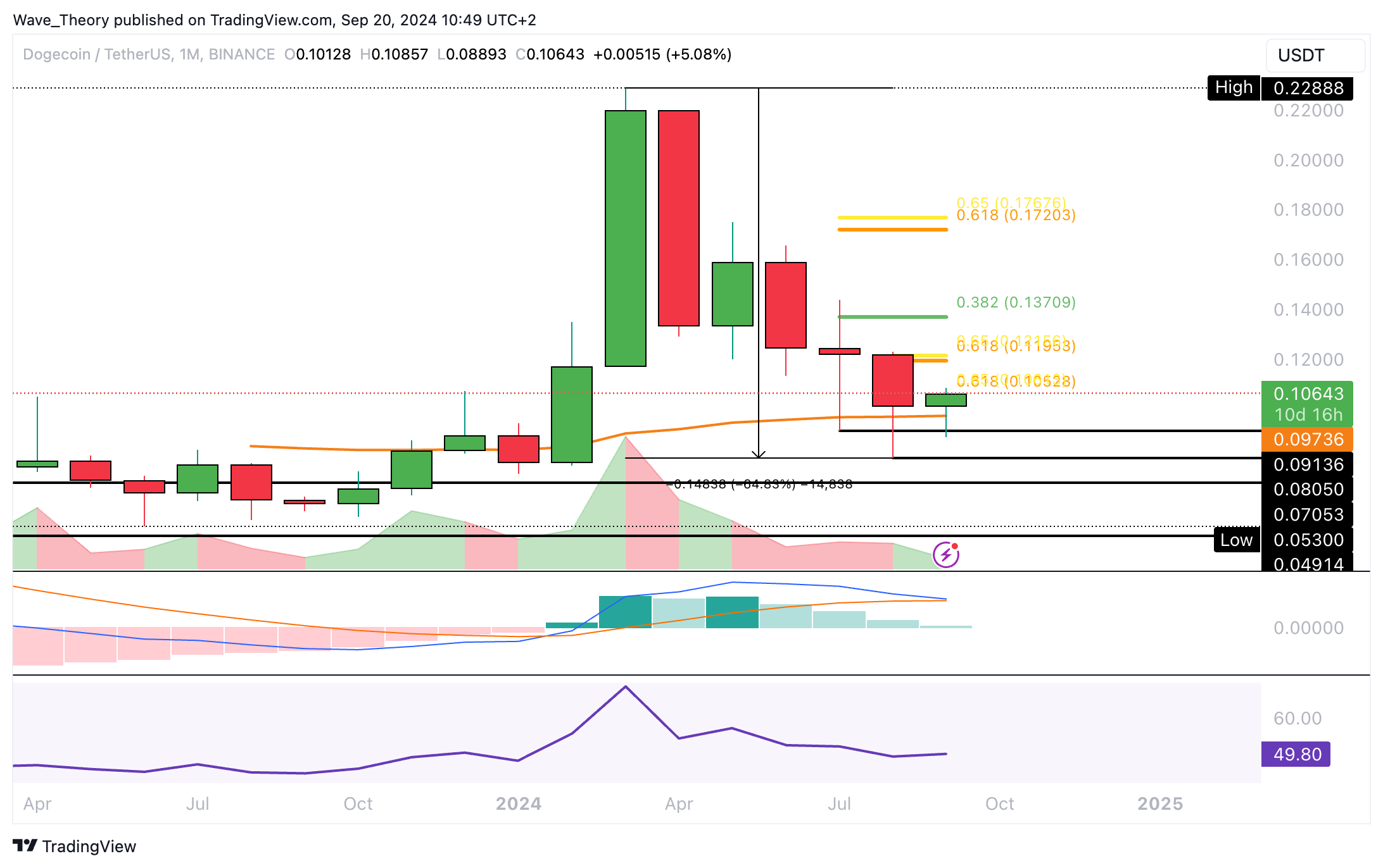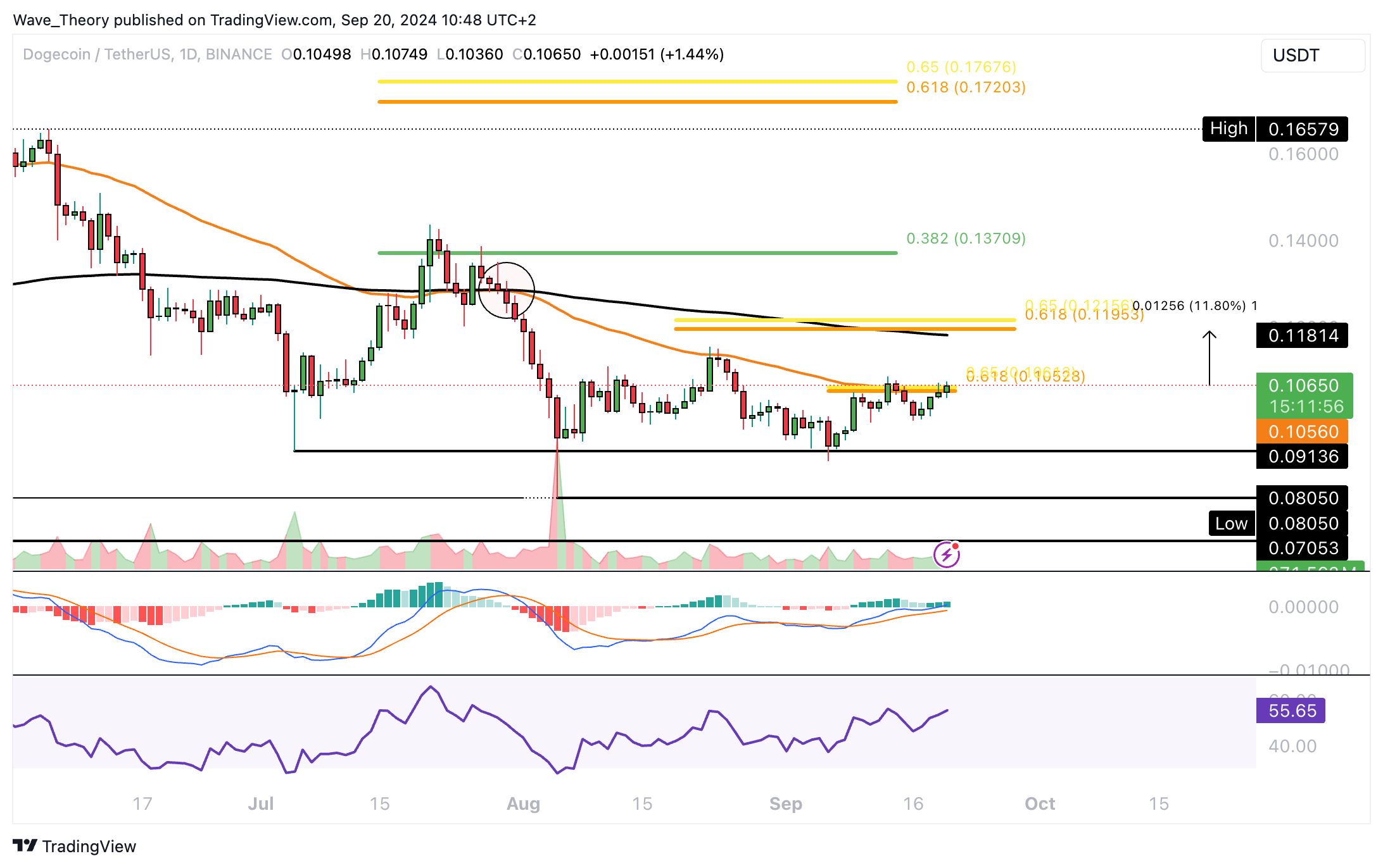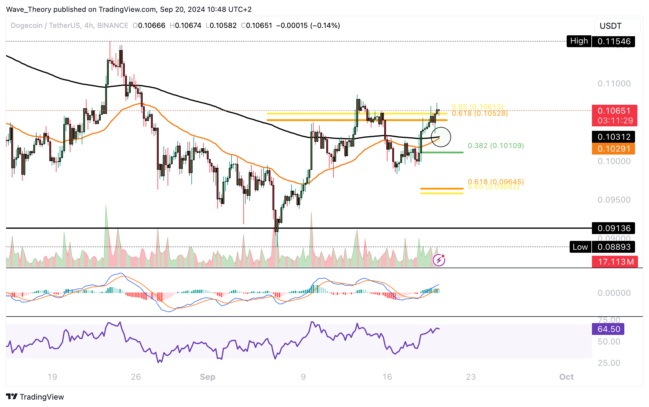 Daraufhin konnte Dogecoin zur Golden Ratio am 50-Tage-EMA bei rund 0,1056 USD steigen. Dort wurde Dogecoin zunächst bärisch abgewiesen.