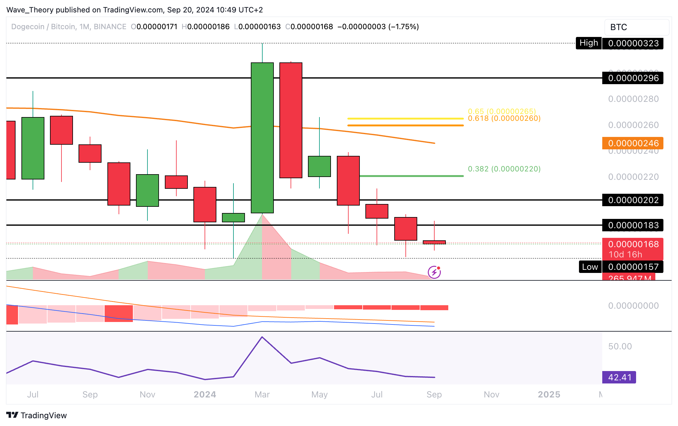 Gegen BTC befindet sich Dogecoin ebenfalls seit sechs Monaten in einer starken Abwärtsbewegung. Dabei weist das Histogramm des MACDs schon seit vier Monaten einen starken Abwärtstrend auf und die MACD Linien sind bärisch gekreuzt.