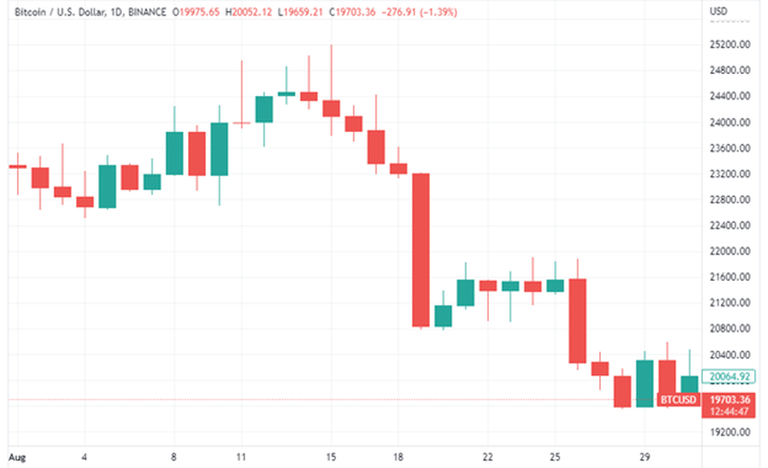 Im August rangierte der Bitcoin Kurs zwischen 19.509 US-Dollar und 25.200 US-Dollar. Der letzte Monatsschlusskurs von Bitcoin lag im Vergleich zu Ethereum jedoch unter dem Eröffnungskurs.