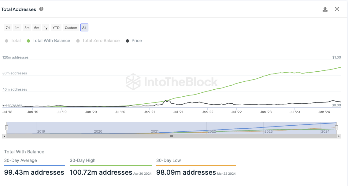 Die Gesamtzahl der TRX Adressen erlebt einen Zuwachs. In den letzten 30 Tagen wurden durchschnittlich 99,43 Millionen TRX Adressen gezählt, die ein TRX Guthaben aufweisen.
