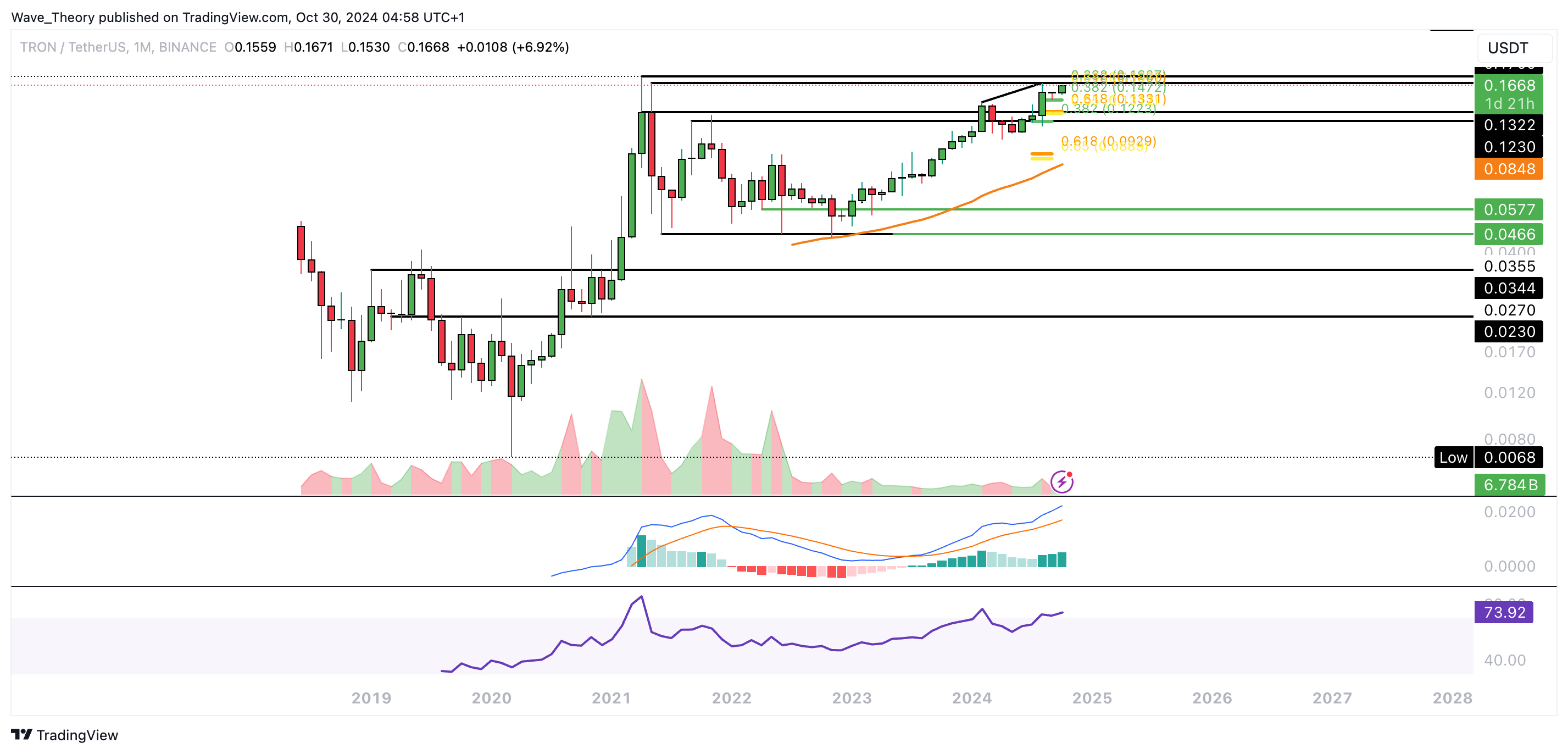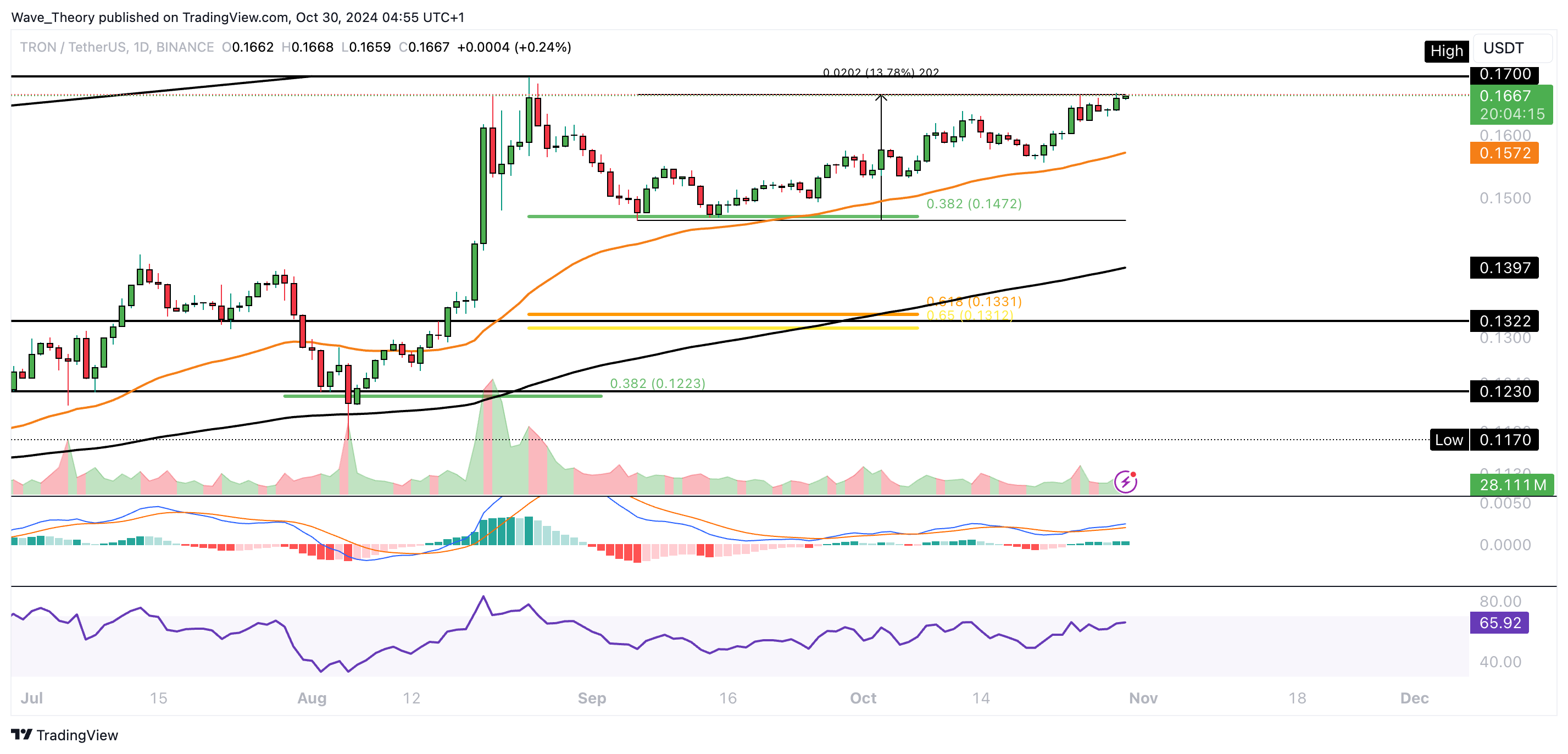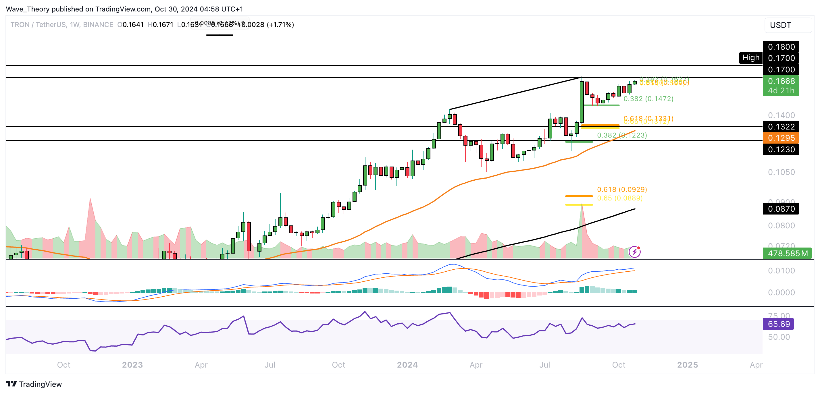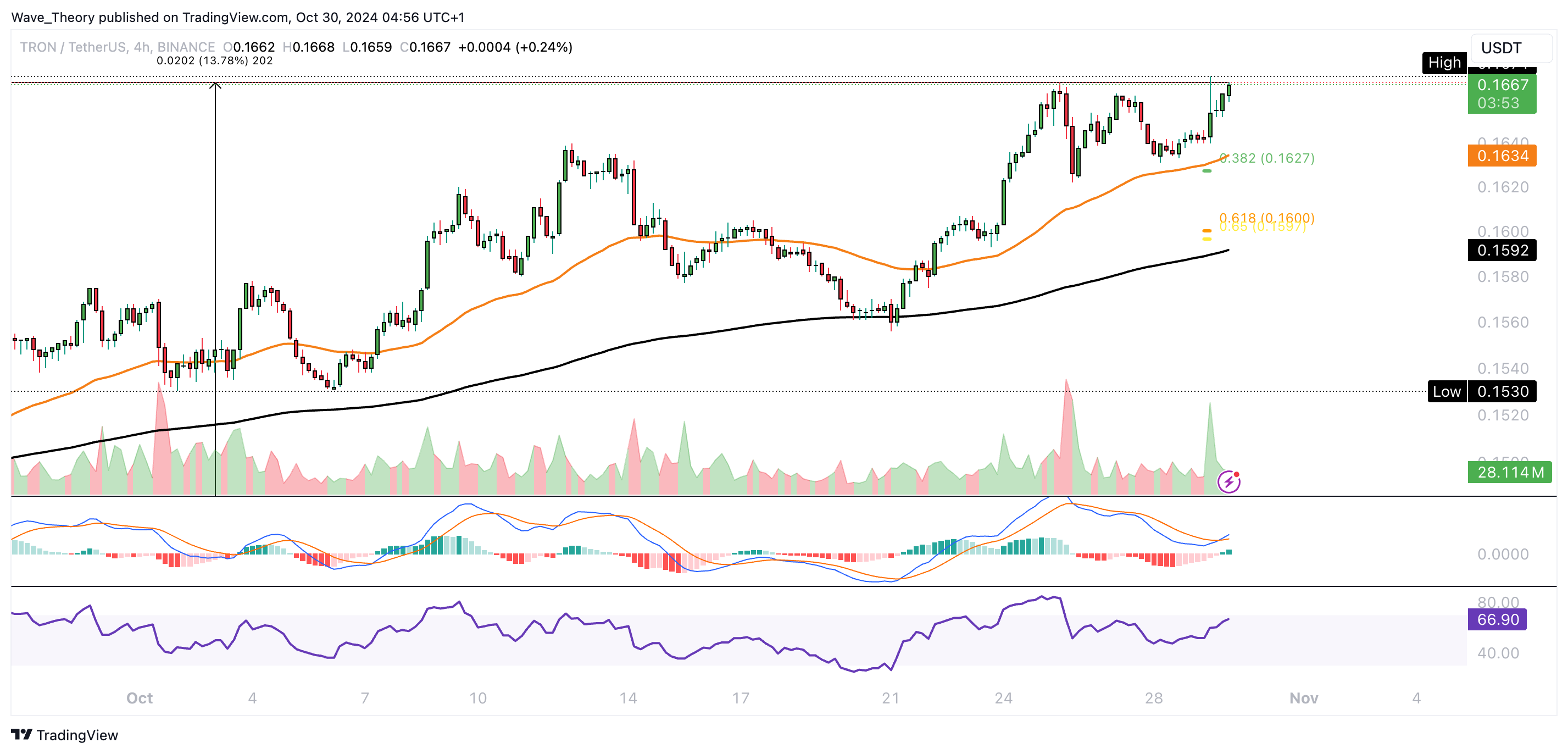 Seit dem bullischen Abpraller an der 0,382 Fib Unterstützung bei rund 0,1472 USD ist der TRX Kurs rund 15 % gestiegen. Damit ist der TRX Kurs kurz davor, den letzten Hochpunkt bei rund 0,17 USD zu erreichen.