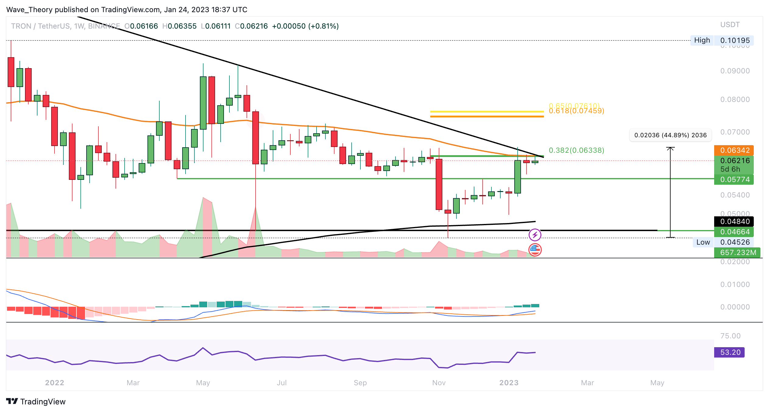 Der TRON Kurs ist aus dem absteigenden Dreieck nicht bärisch ausgebrochen, sondern konnte sich erfolgreich über dem 50-Monate-EMA bei rund 0,0462 USD halten. Damit tickt nun auch wieder das Histogramm des MACDs im Monatschart bullisch höher.