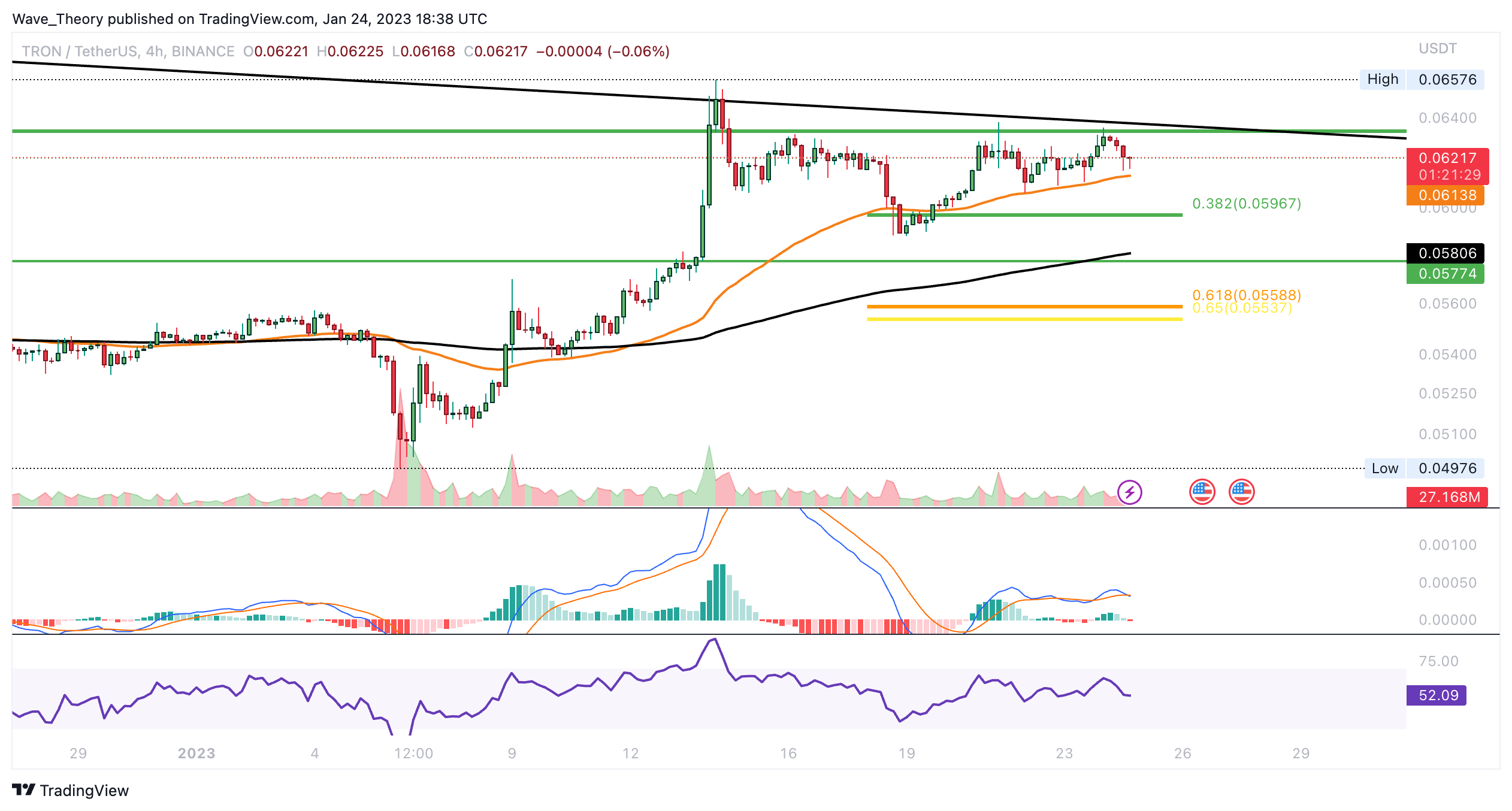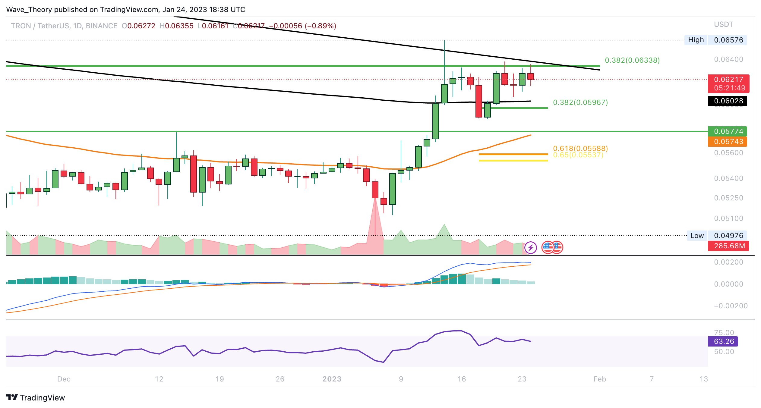 An diesem Fib Widerstand liegt zudem sowohl die Trendlinie des absteigenden Dreiecks als auch der 50-Wochen-EMA, welcher als zusätzlicher Widerstand fungiert. Sollte TRX dort jetzt auf bärische Ablehnung stoßen, könnte TRON zu den nächsten signifikanten Fib Unterstützungen bei rund 0,0597 USD bzw. 0,055 USD korrigieren.