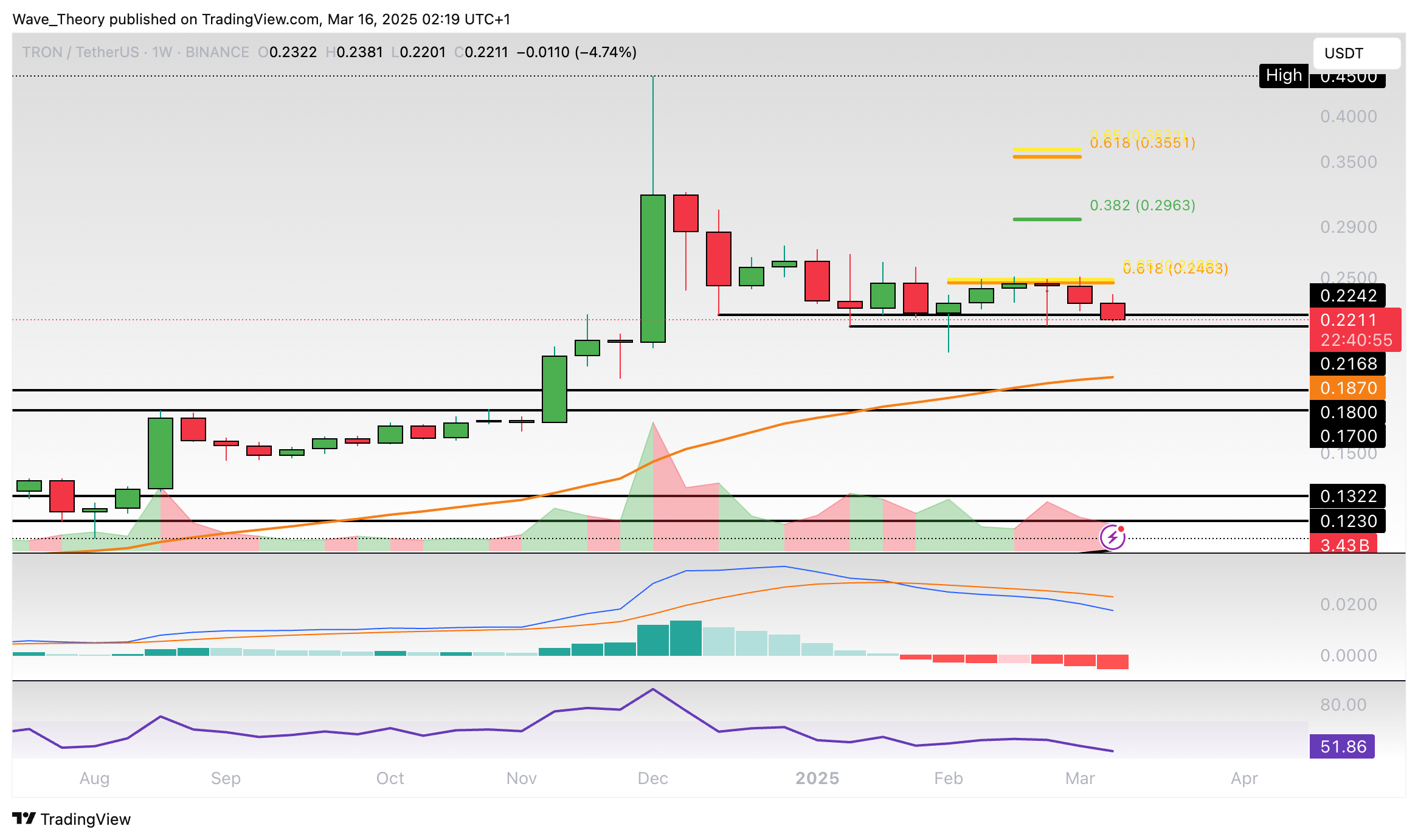 Letzte Woche wurde TRX erneut am Golden Ratio Widerstand bei rund 0,25 USD bärisch abgewiesen. Sollte TRON jetzt die aktuelle Unterstützungszone zwischen rund 0,217 USD und 0,224 USD bärisch brechen, wartet am 50-Wochen-EMA bei rund 0,187 USD die nächste signifikante Unterstützung.