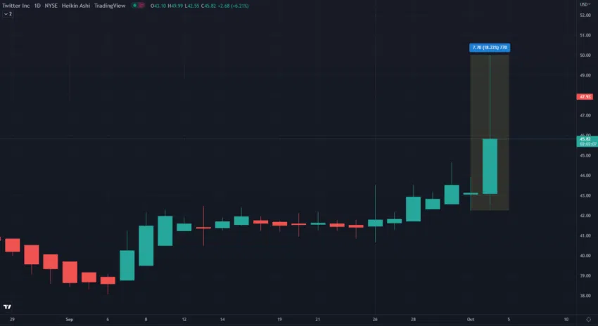 Laut Bloomberg bekundete Musk in einem Brief an das Unternehmen erneut seine Absicht, den Social-Media-Riesen zu kaufen. Nach dieser Ankündigung sprang der Aktienkurs von Twitter um 18 % in die Höhe – der Handel mit der Aktie musste sogar ausgesetzt werden.