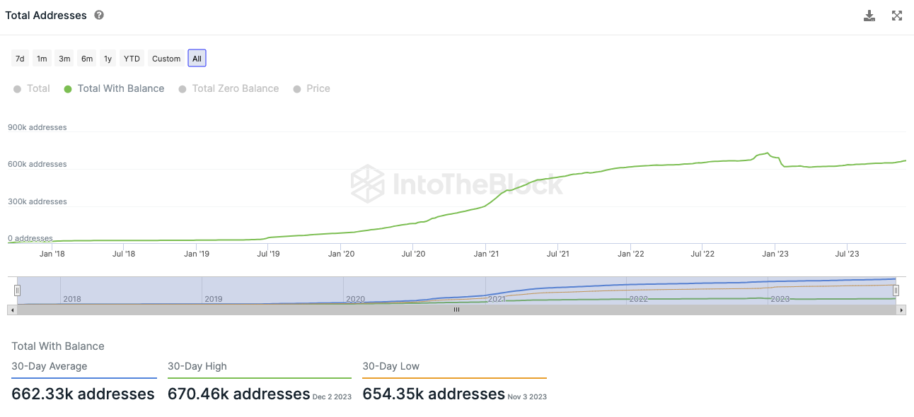 In den letzten 30 Tagen wurden durchschnittlich 662.000 Chainlink Adressen gezählt, die ein LINK Guthaben aufweisen