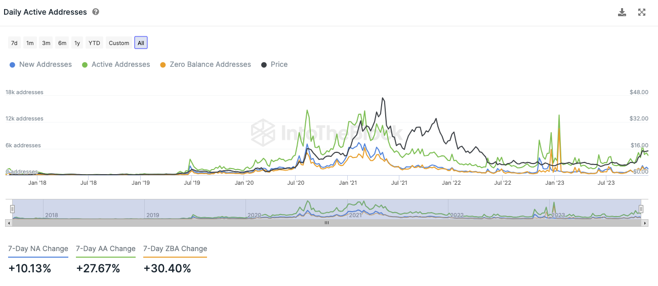 Die Anzahl an neuen Adressen ist im gleichen Zeitraum um rund 10 % gestiegen, wohingegen die Anzahl an Adressen ohne LINK Guthaben sogar um rund 30 % gestiegen ist.