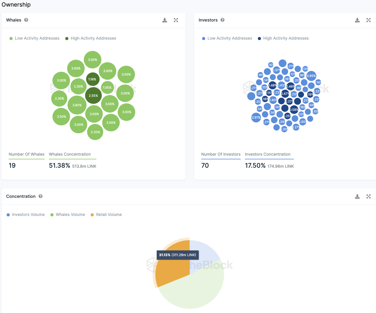 Kleinanleger besitzen rund ein Drittel aller im Umlauf befindlichen Chainlink Token. Ein unglaublicher Anteil von mehr als der Hälfte liegen dabei in den Händen von Walen. Adressen, die mehr als 1 % der Token Supply halten.