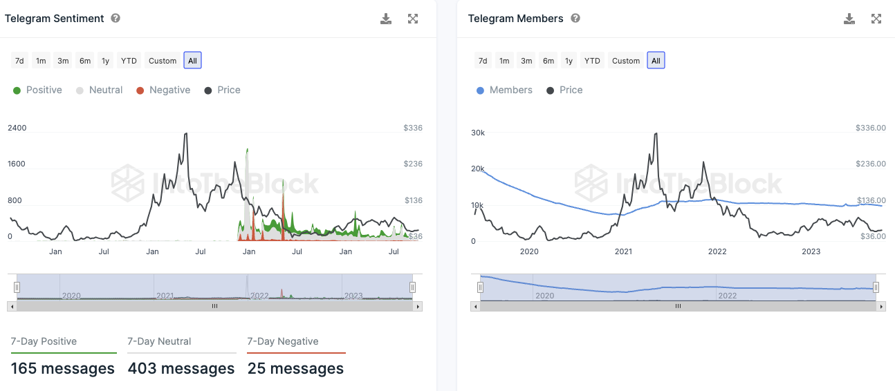 In den vergangenen sieben Tagen war die Meinung zu Litecoin auf Telegram überwiegend positiv. Es gab 165 positive Kommentare im Vergleich zu 25 negativen. Allerdings verzeichnet die Litecoin Telegram-Gruppe einen Mitgliederschwund.