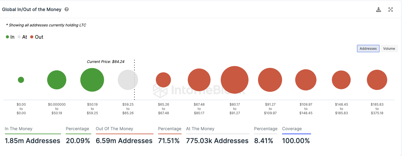 Über 71,5 % der Litecoin Investoren machen laut den Daten von IntoTheBlock derzeit Verluste. Denn die überwältigende Mehrheit der Adressen ist im Verlust.