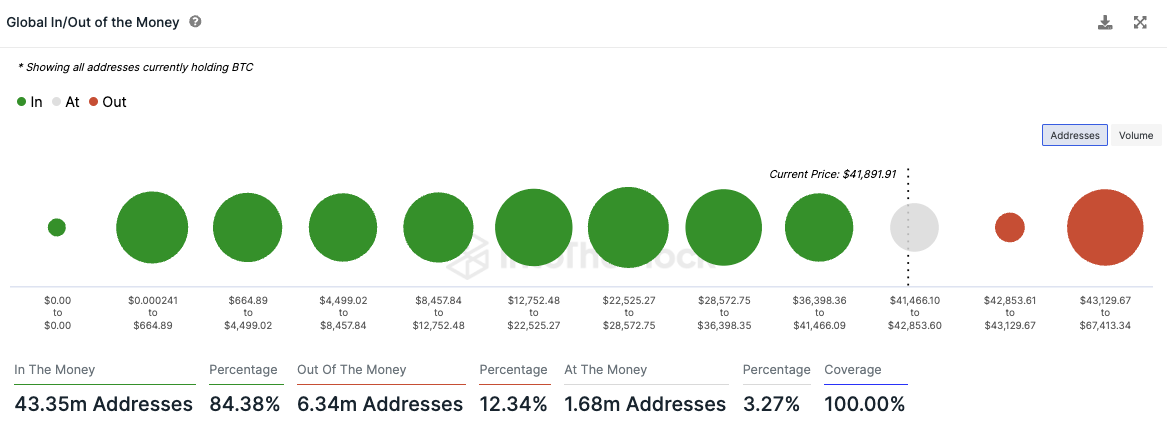 Doch eine überwältigende Mehrheit von rund 84 % befindet sich zum aktuellen Kurs von rund 42.000 USD im Plus.