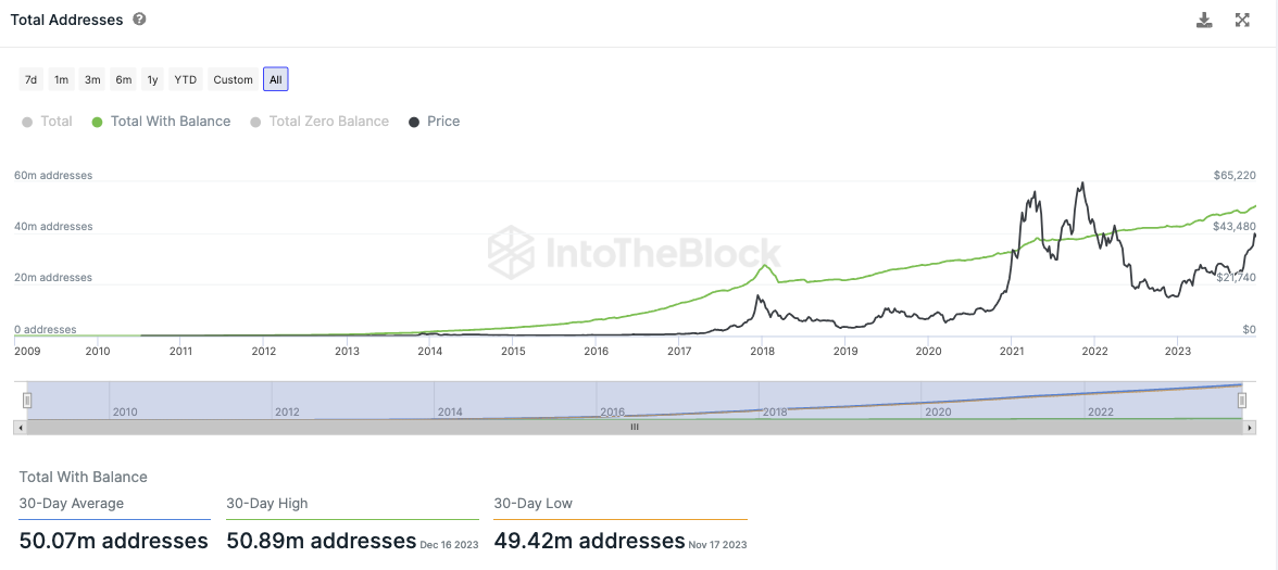 Die Gesamtanzahl an BTC Adressen befindet sich dennoch in einem beständigen Aufwärtstrend. So lagen in den letzten 30 Tagen durchschnittlich 50 Millionen BTC Adressen vor.